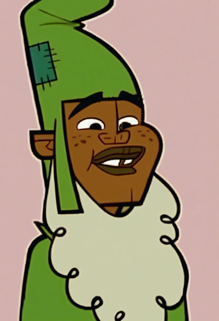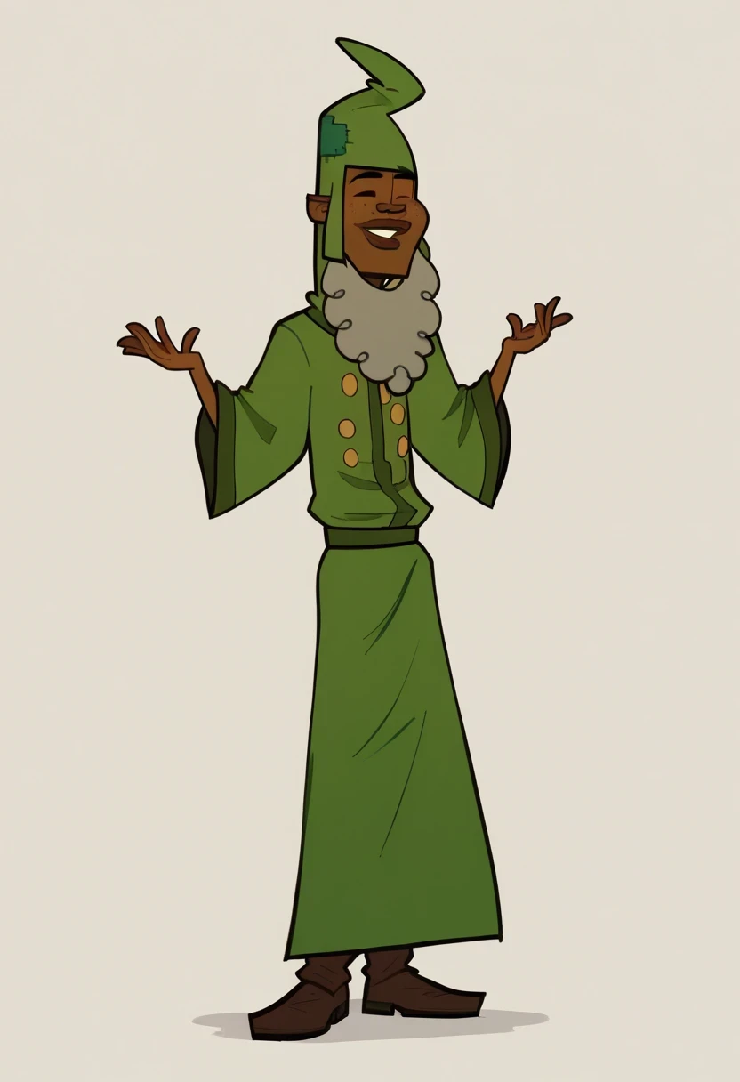 LeonardTDPI, 1boy, dark skinned male, wizard outfit, long green robe, green hat with patches, large fake gray beard, freckles, lips, big lips, cosplay