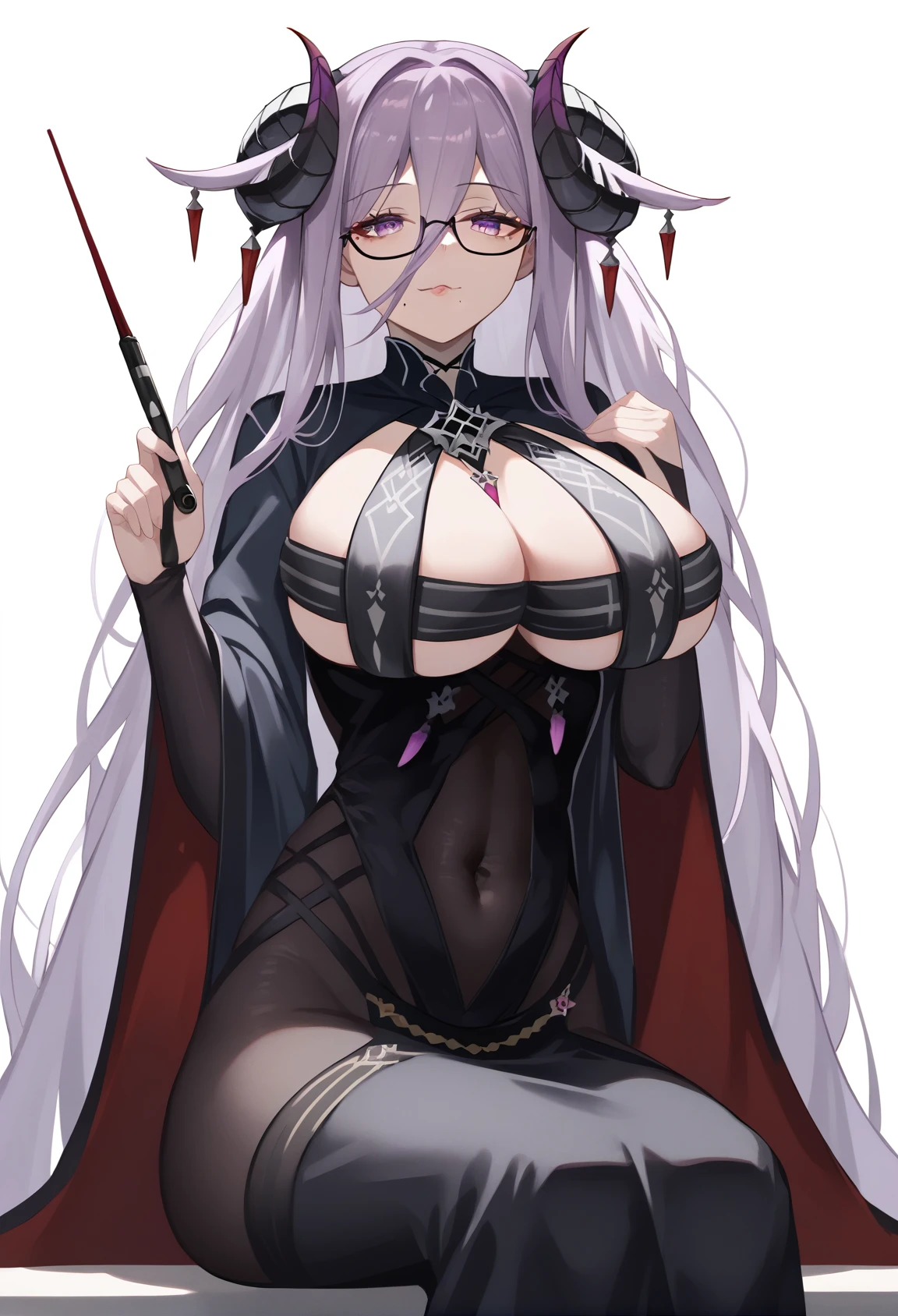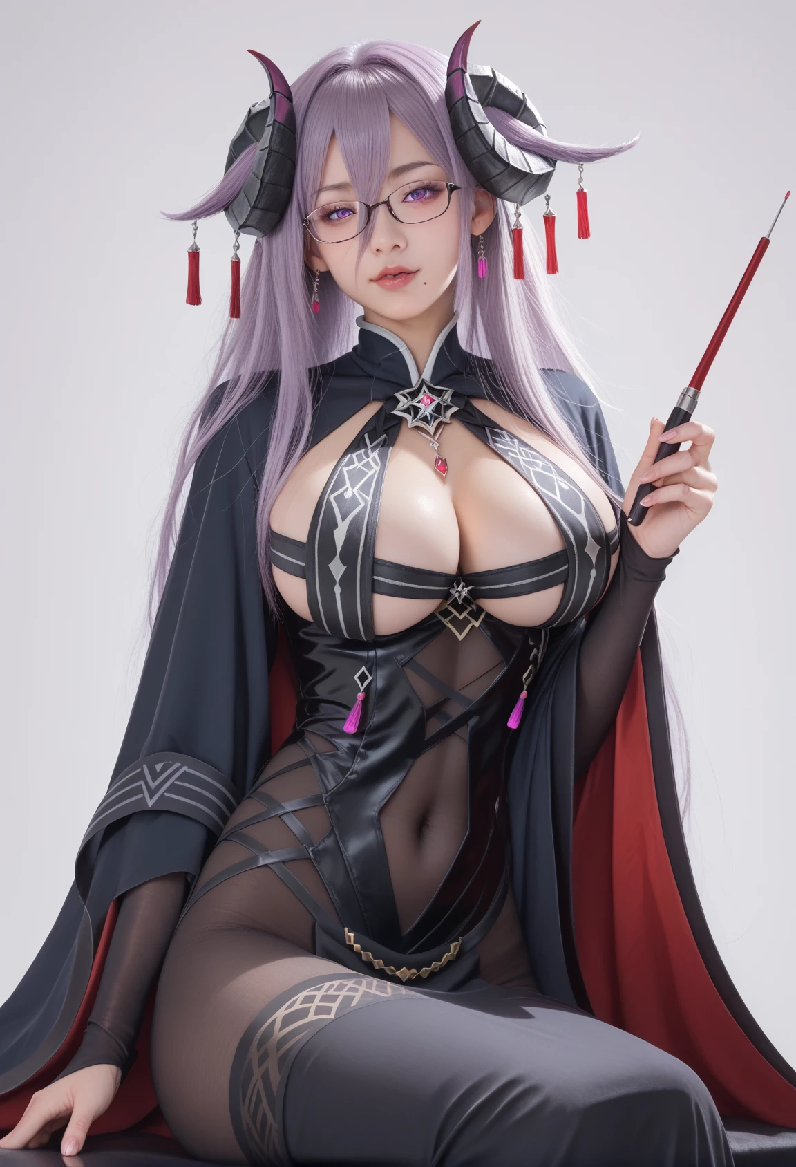 原版(origen):friedrich_carl_\(azur_lane\), demon_horns, long_hair,purple_eyes, glasses,large breasts, mole_under_mouth, covered_navel, black_dress, breast_curtains, wide_sleeves, black_cape,