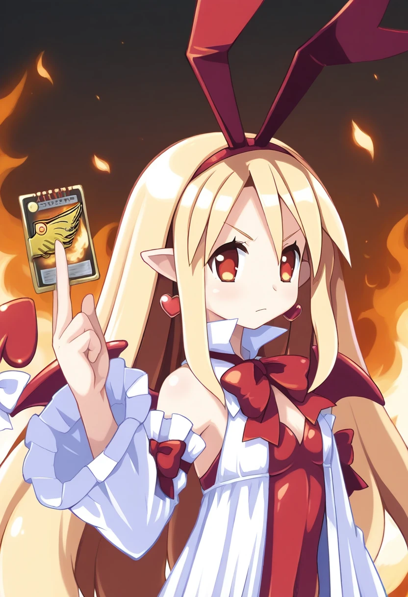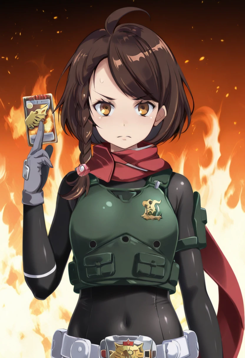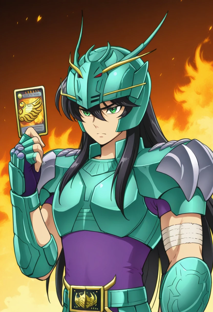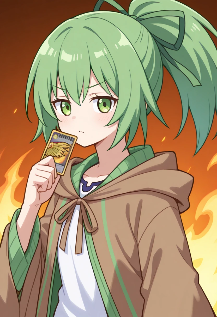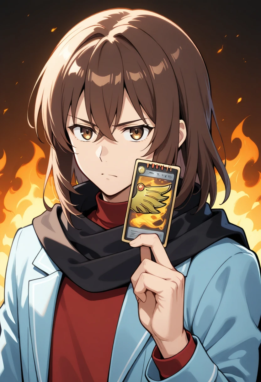 ryukisurvivalcard, hand up, holding card, fire background,