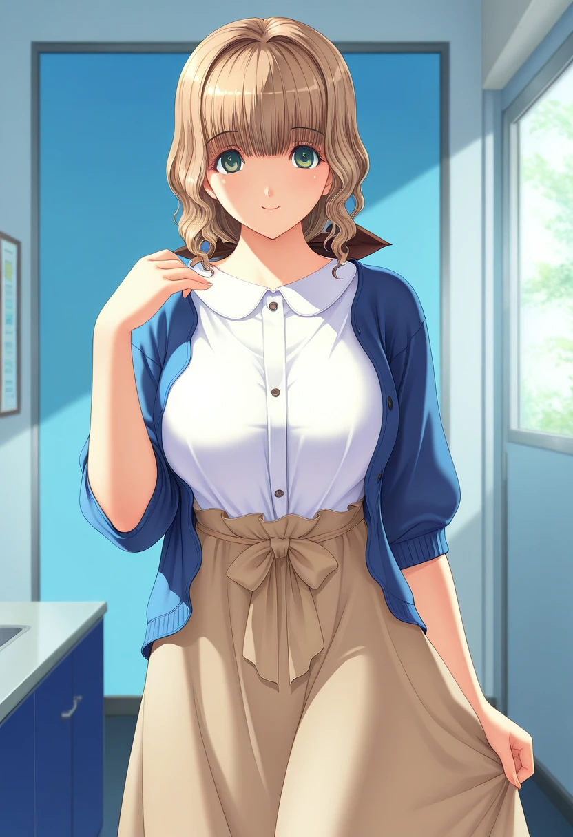 - casual, open cardigan, blue cardigan, wing collar, white blouse, sleeves past elbows, buttons, light brown skirt, long skirt,