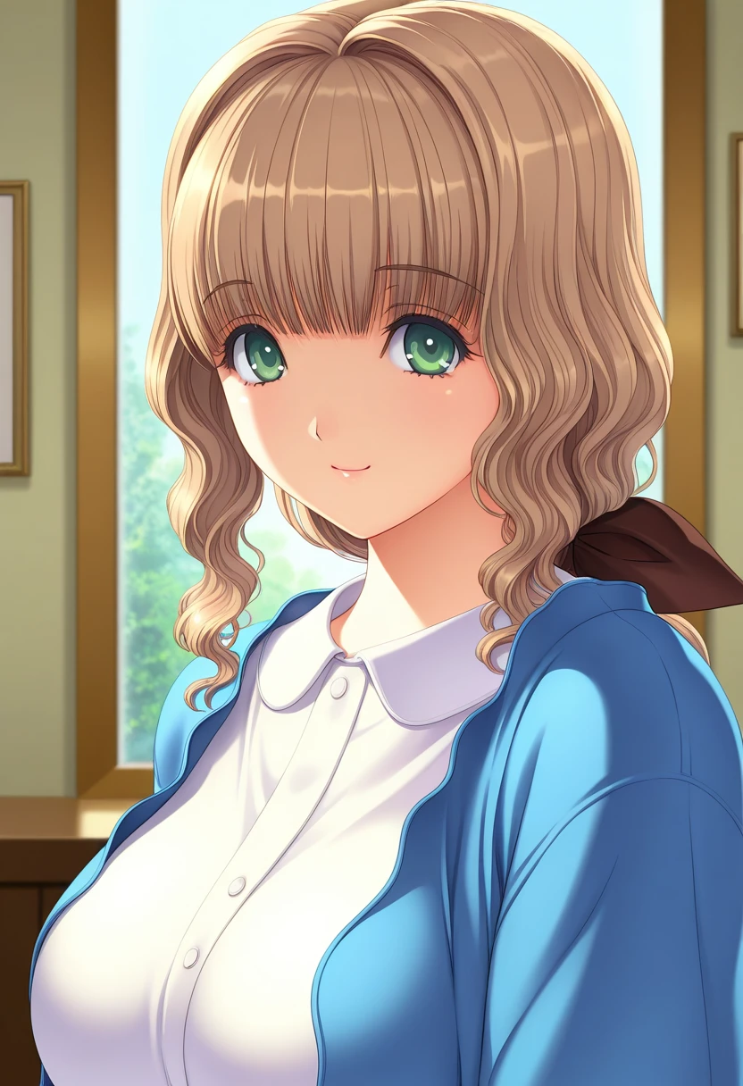 junkoww, mature female, green eyes, tareme, light brown hair, long hair, wavy hair, low ponytail, hair bow, brown bow, blunt bangs, hair between eyes, large breasts,