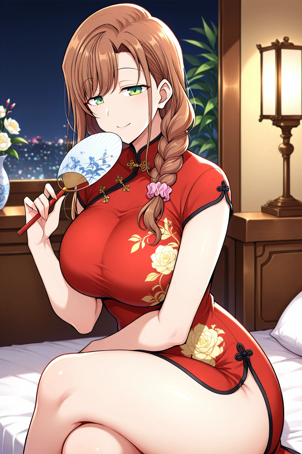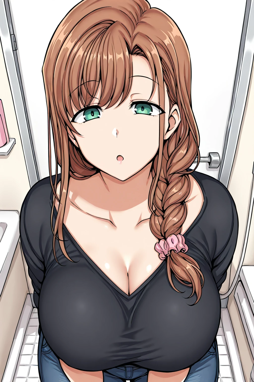 Basic prompt : 1girl,solo, amane,large breasts, long hair, braid, brown hair, green eyes, hair over shoulder, scrunchie,black v-neck tee shirt,denim pants,