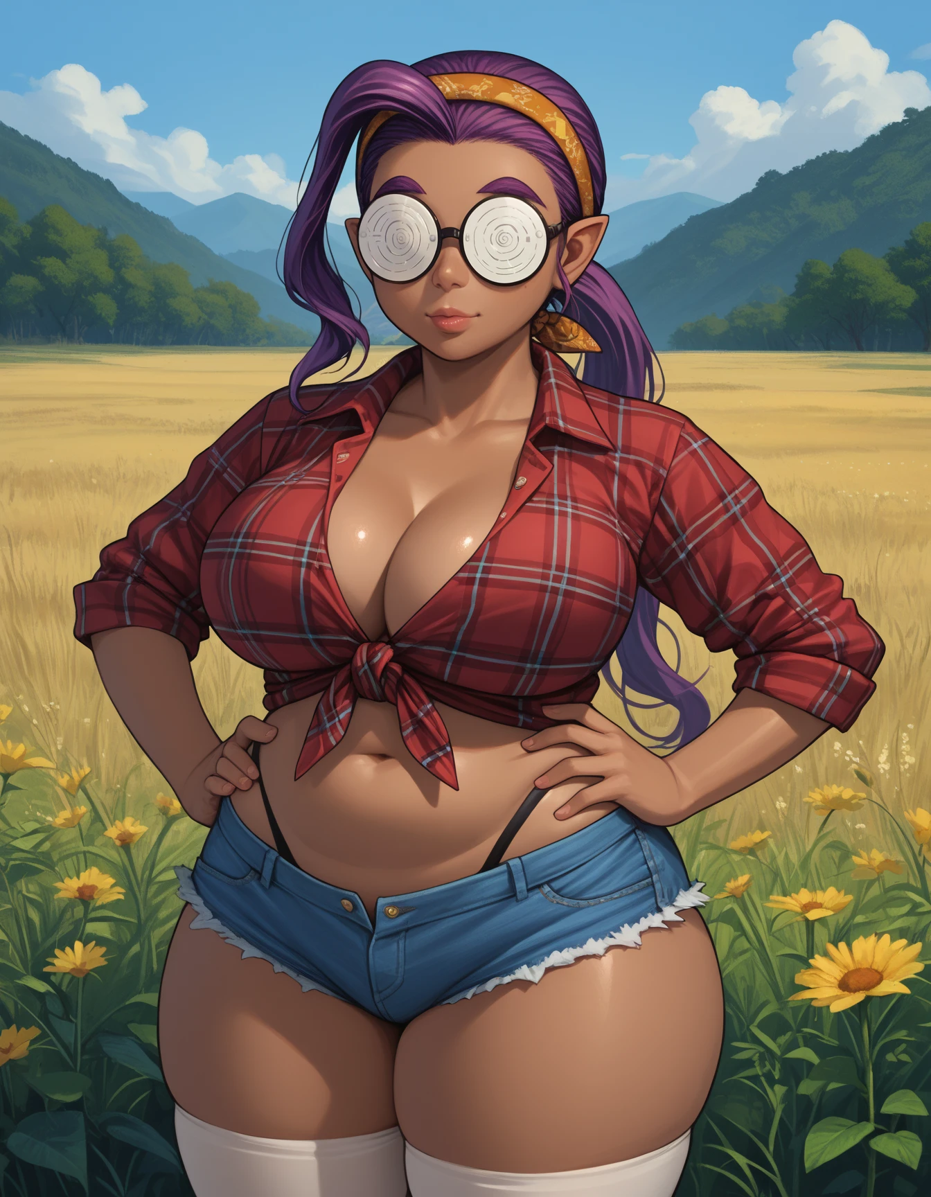 "medel, dark-skinned female, pointy ears, dark elf, long hair, ponytail, coke-bottle glasses, opaque glasses,hairband,purple hair,covered eyes"