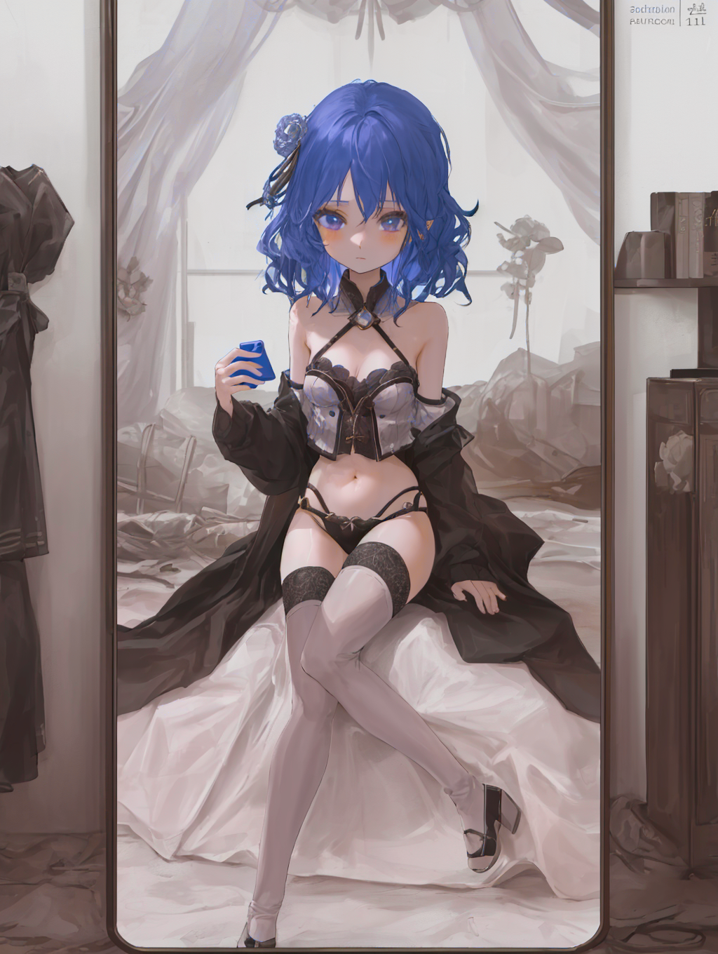 Some of useful keyword: {sitting | lying | kneeling}, {from behind | looking at viewer}, {pulling clothes, ???????, ??????????, lingerie}, holding phone
