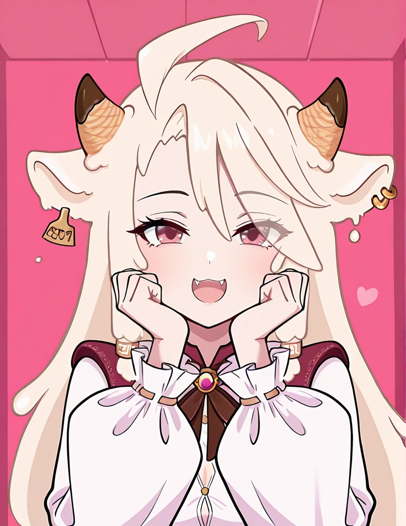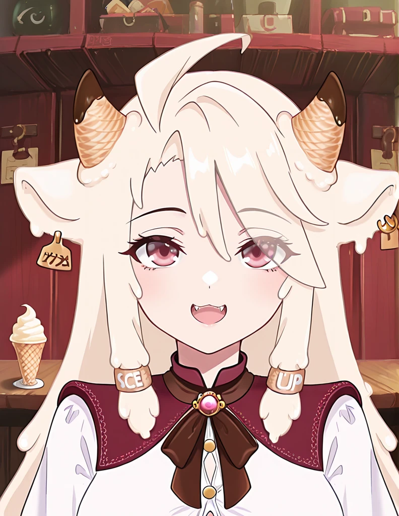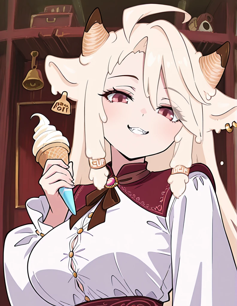 Vericoo, 1girl, solo, long hair, blonde hair,, red eyes, animal ears, white hair, ahoge, earrings, horns, food, pink eyes, fangs, piercing, ear piercing, single earring, ice cream, cow ears, cow horns, goat horns, cow girl, ice cream cone, sheep ears, sheep girl, melting, ear tag, brown horns,eyes visible through hair, horn ornament