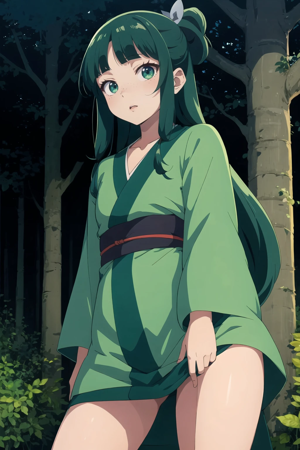 Recommended prompts: Maomao, 1girl, long hair, green hair, freckles, bangs, blue eyes, blunt bangs