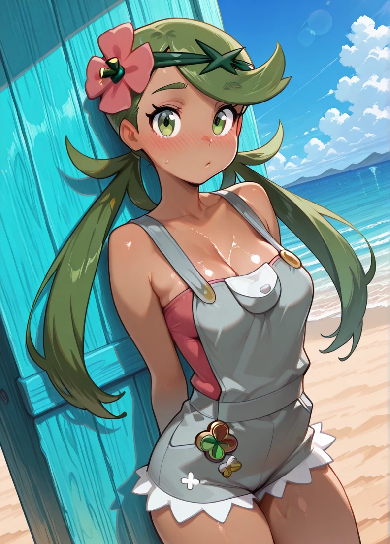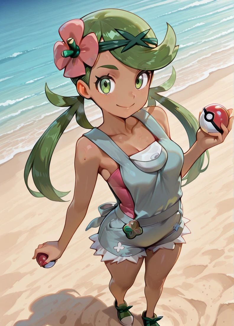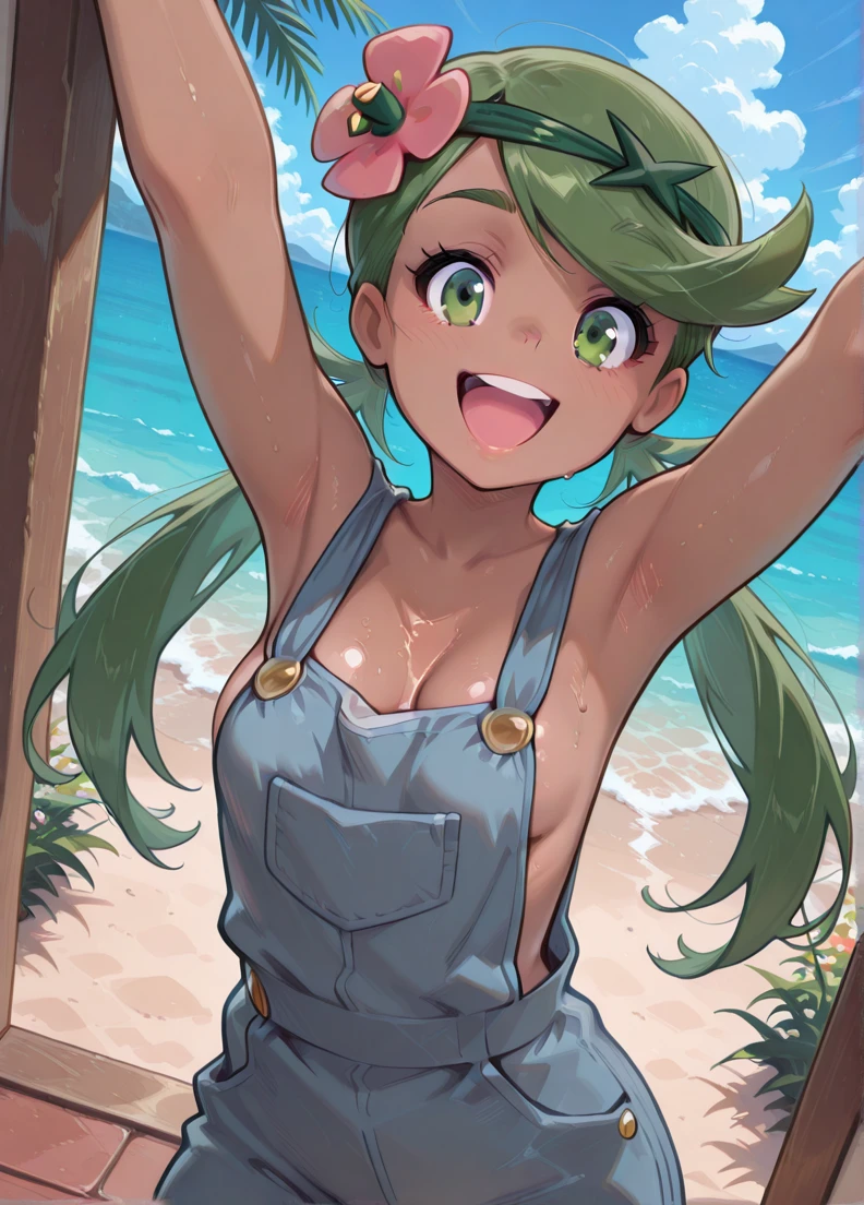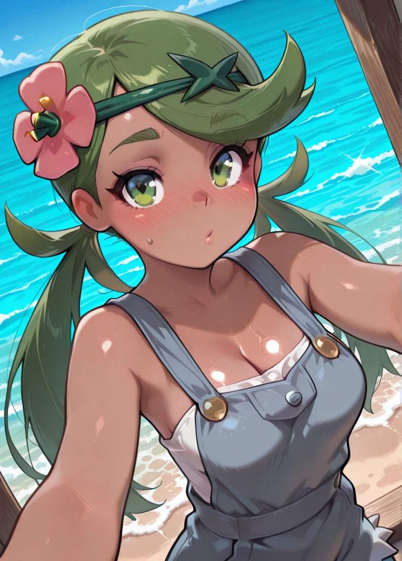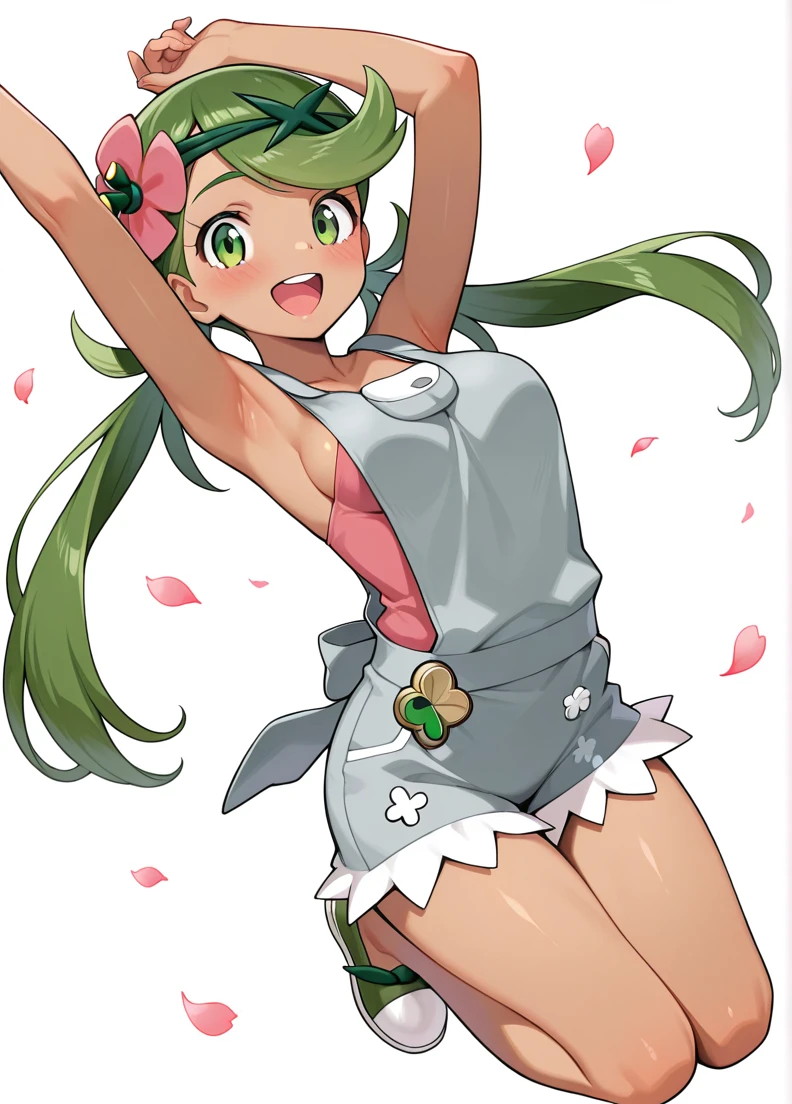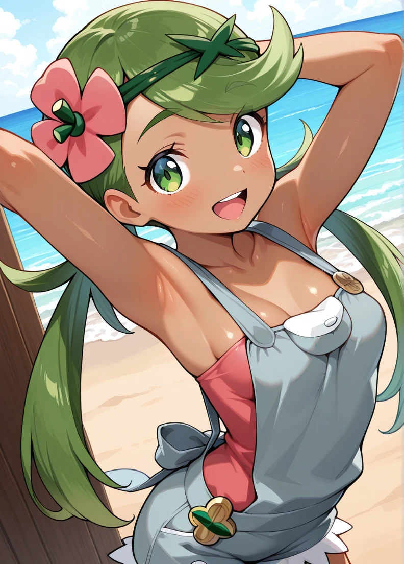 mallowxd, 1girl, dark skin, dark-skinned female, green hair, green eyes, hair flower, hair ornament, long hair, twintails,