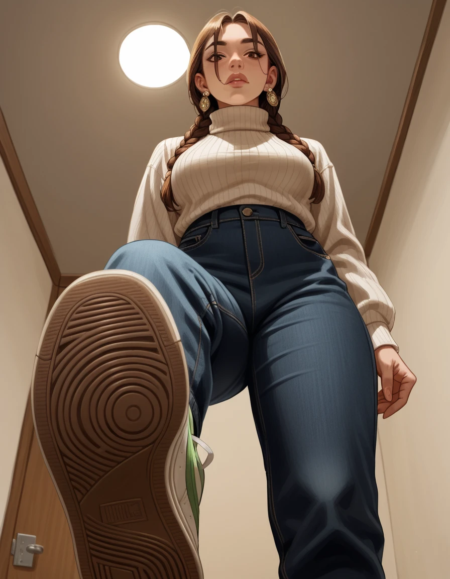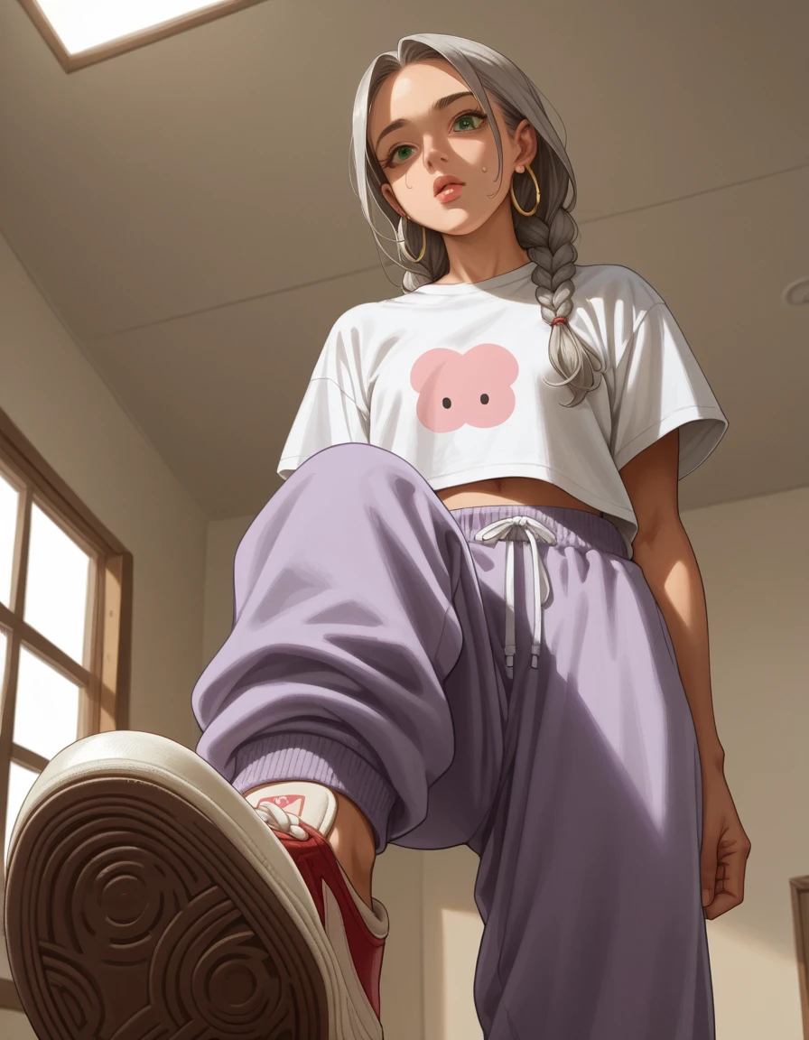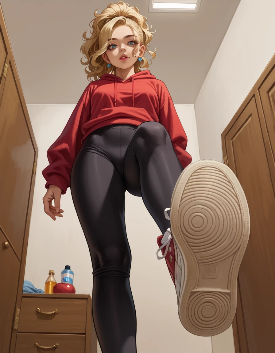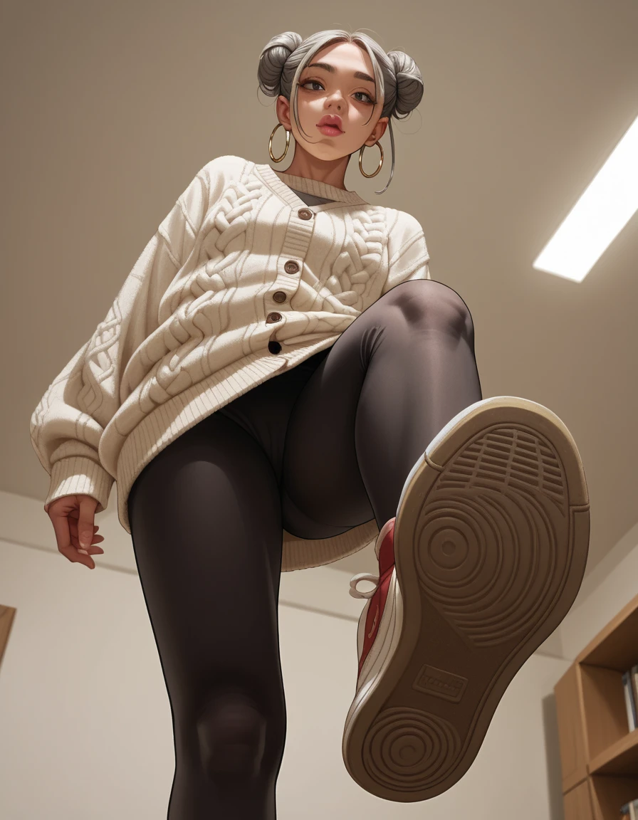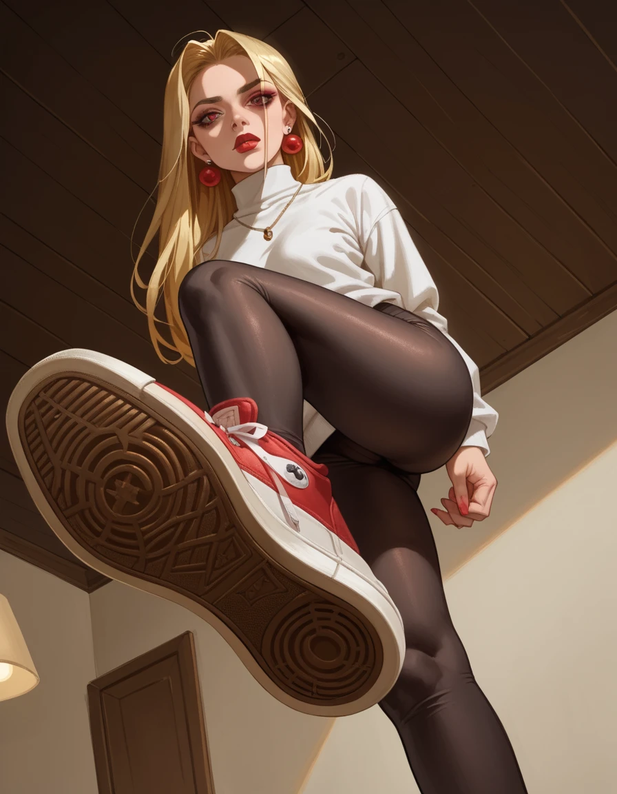 hud_v4nspose, sneakers, shoe soles, from below, indoors, ceiling, foreshortening, perspective