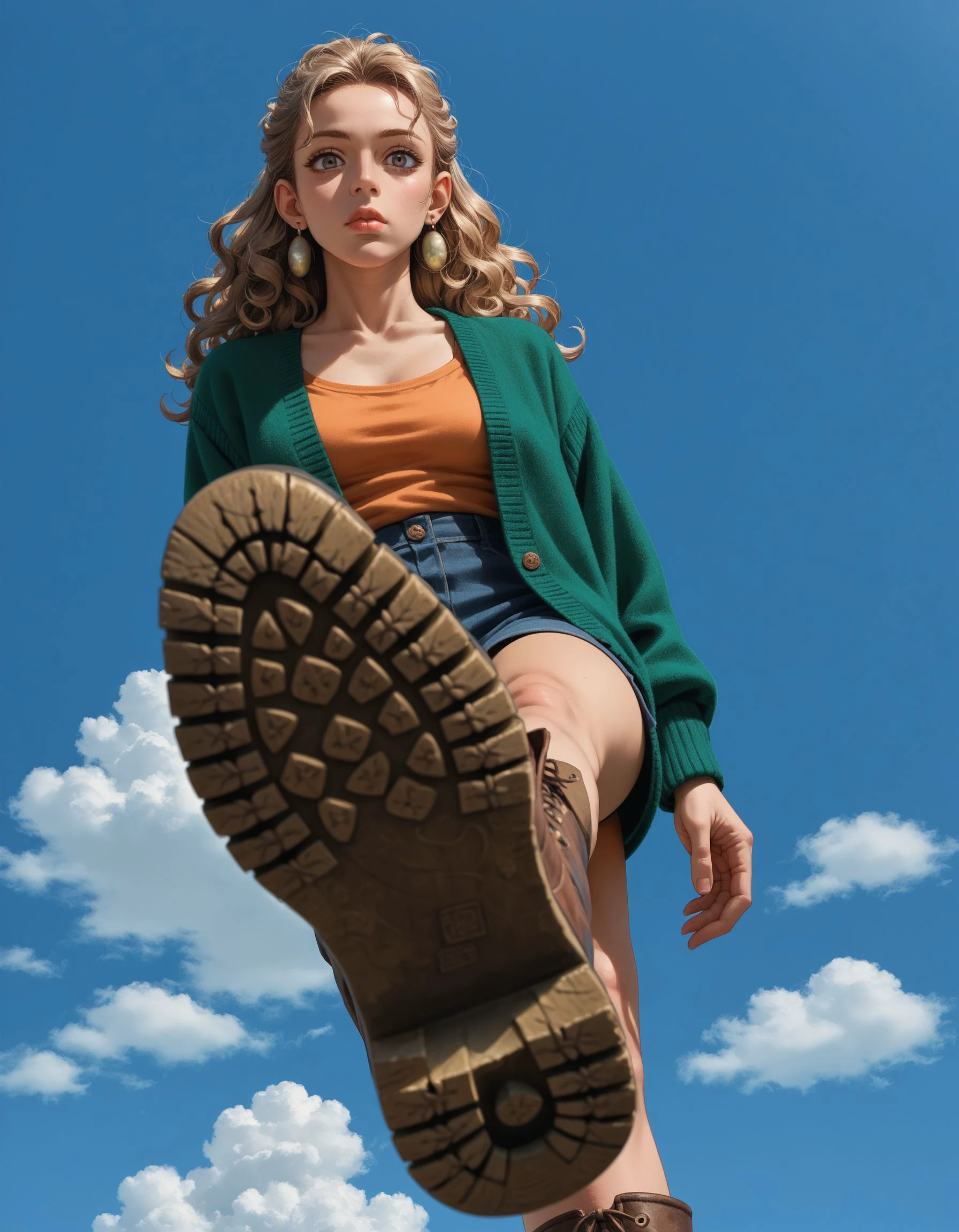 hud_v4nspose, sneakers, from below, solo, sky, foreshortening, perspective,