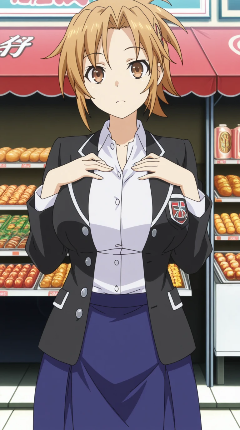 blazer, black blazer, shirt, white shirt, collared shirt, skirt, blue skirt, open clothes,