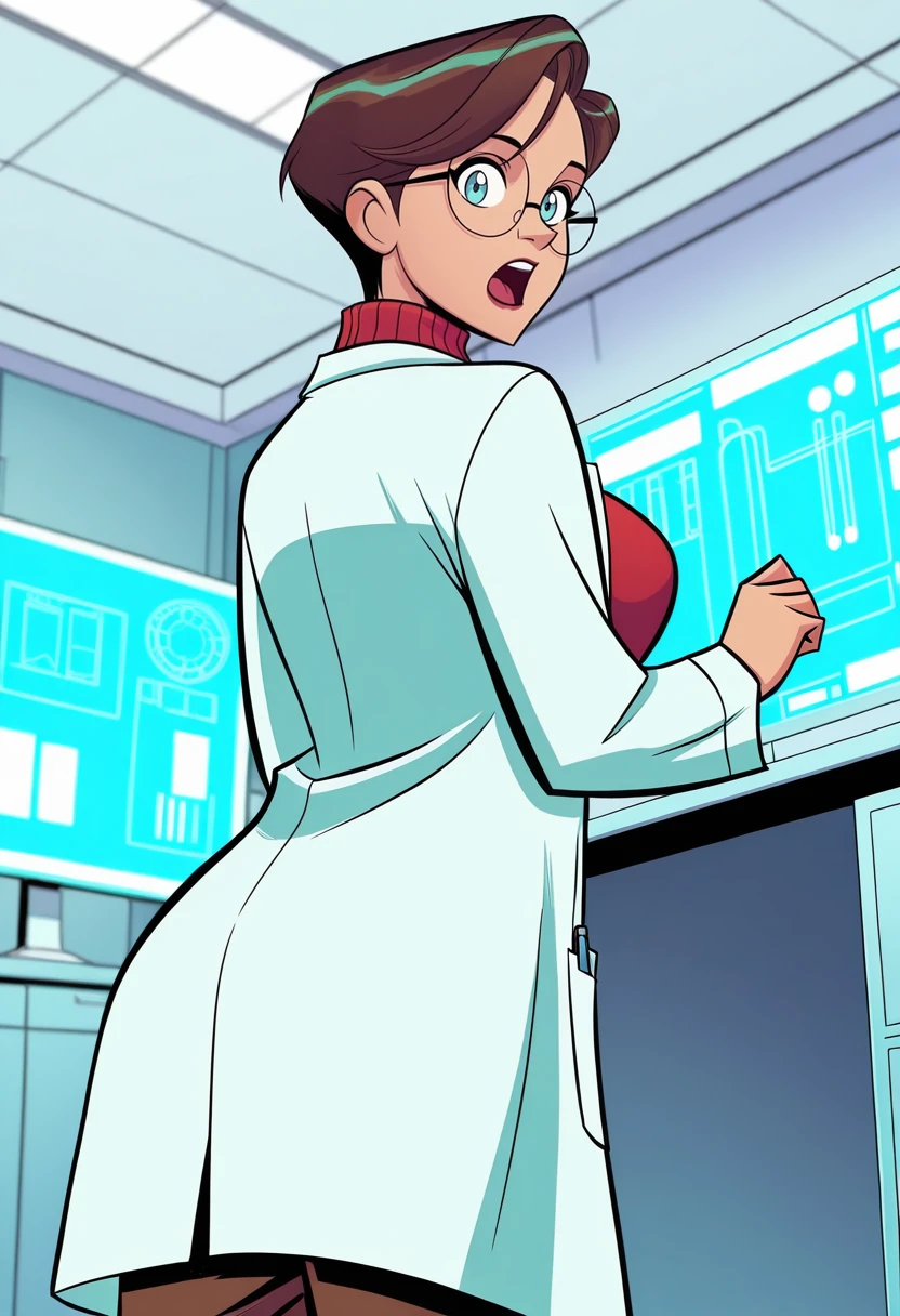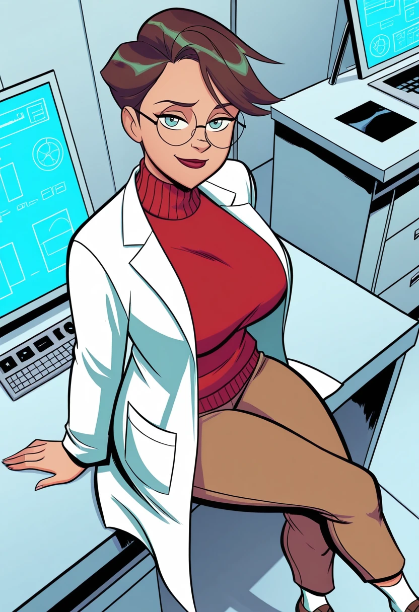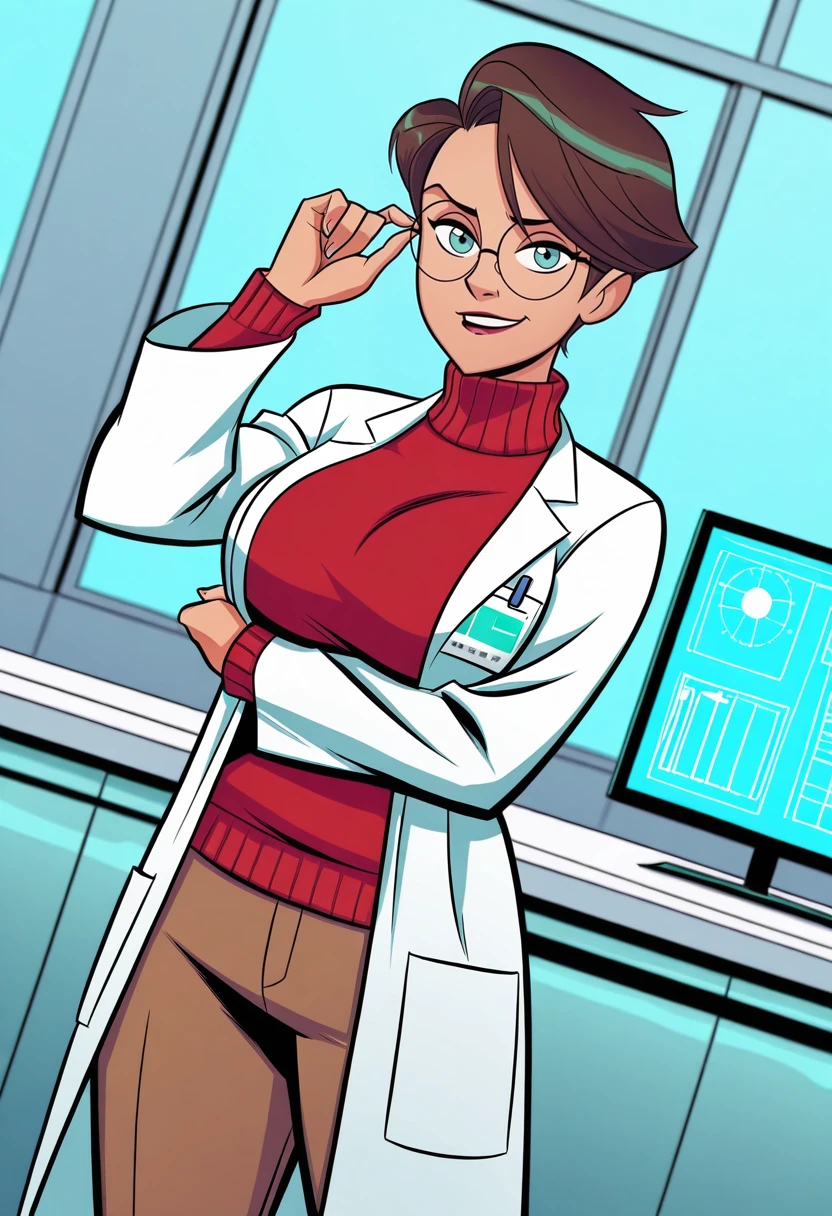 jessemajestic, 1girl, solo, short hair, brown hair, blue eyes, large breasts, curvy, large hips,Scientific Researcher Outfit: