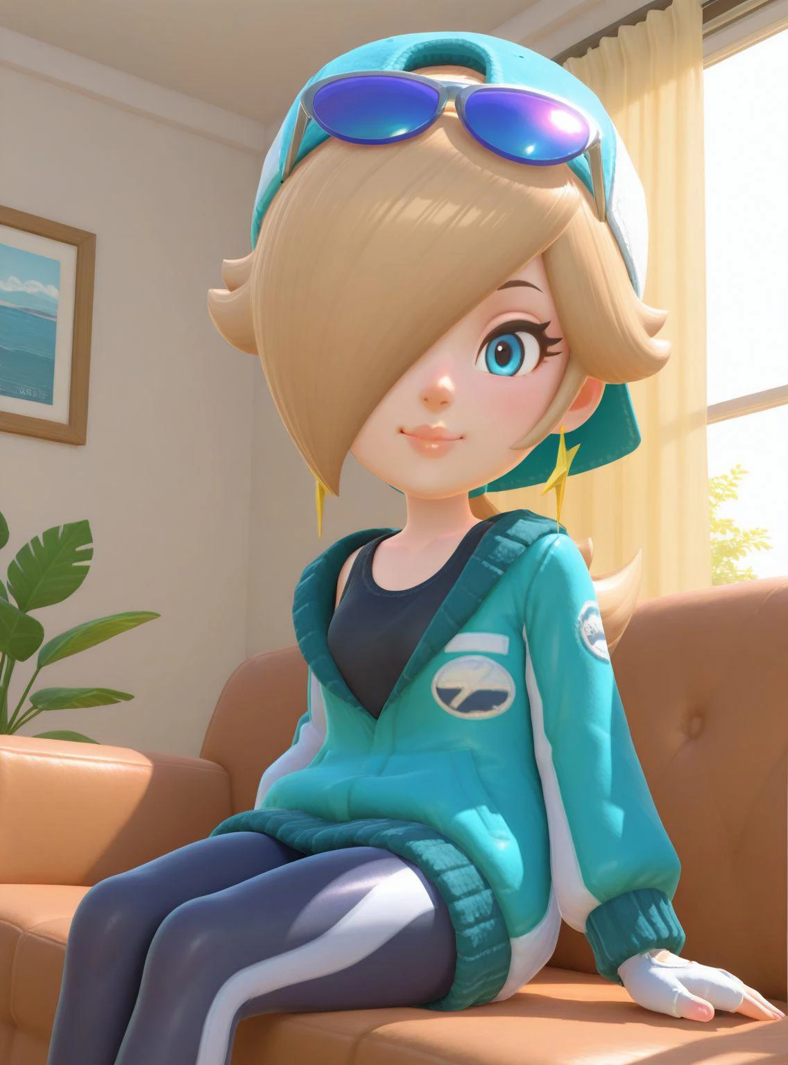 rosalinatouringmkw, blue and white jacket, blue and white hat, white fingerless gloves, tank top, blonde hair, sunglasses on head, star earrings, hair over one eye, backwards hat, leggings