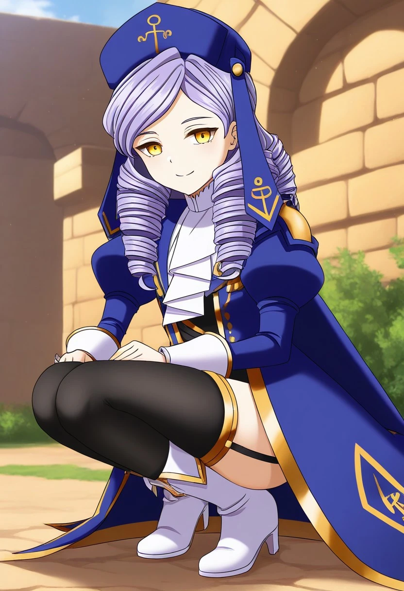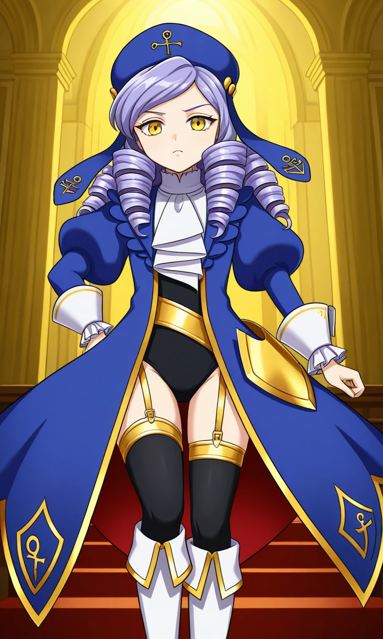 dlanor a. knox,light purple hair, yellow eyes, long hair, low drilled hair, drill hair, side swept bangs,blue cape,white cuffs,white ascot,black thighhighs,gold garter straps,black leotard.white boots