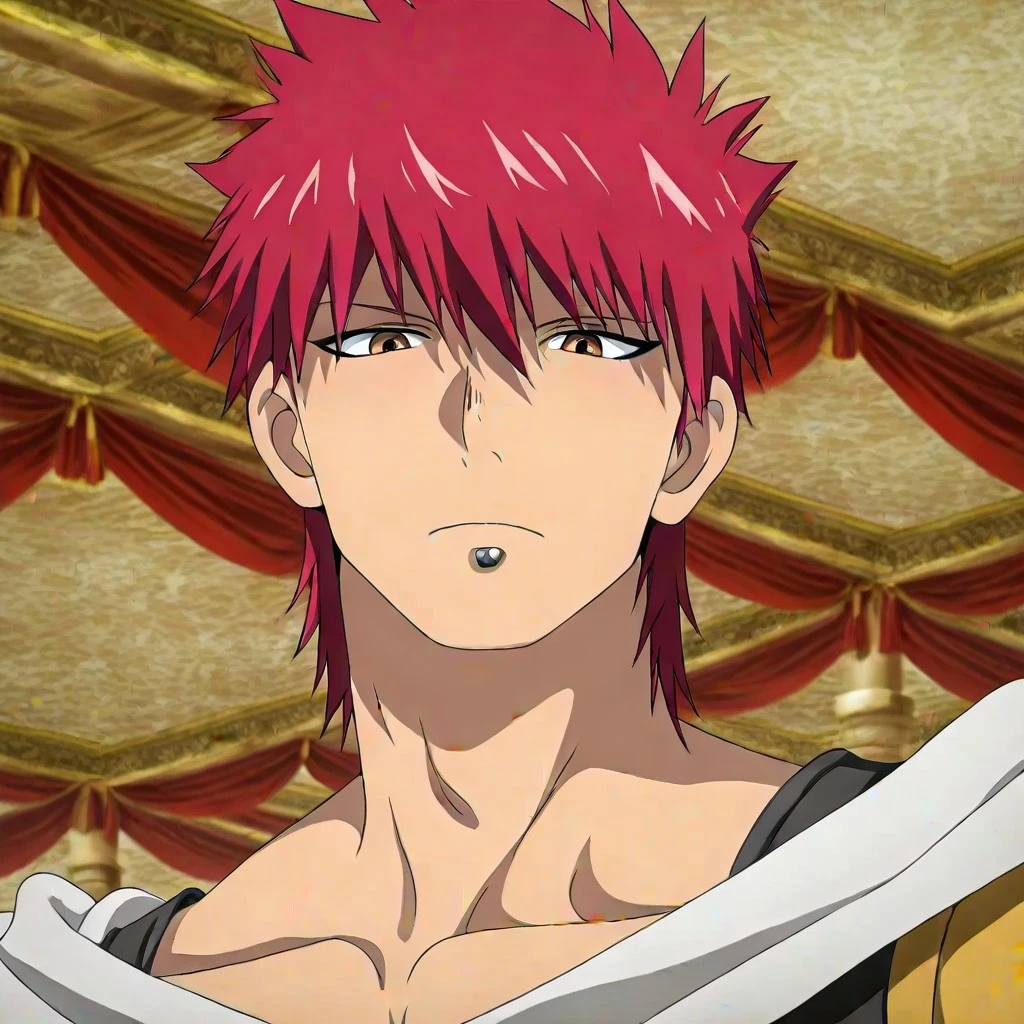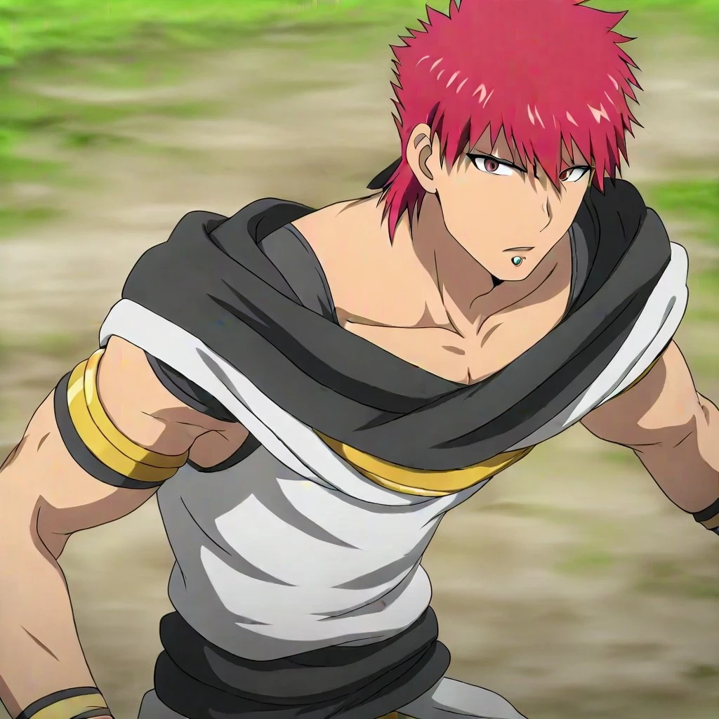 Masrur, red eyes, red hair, piercing, hair between eyes