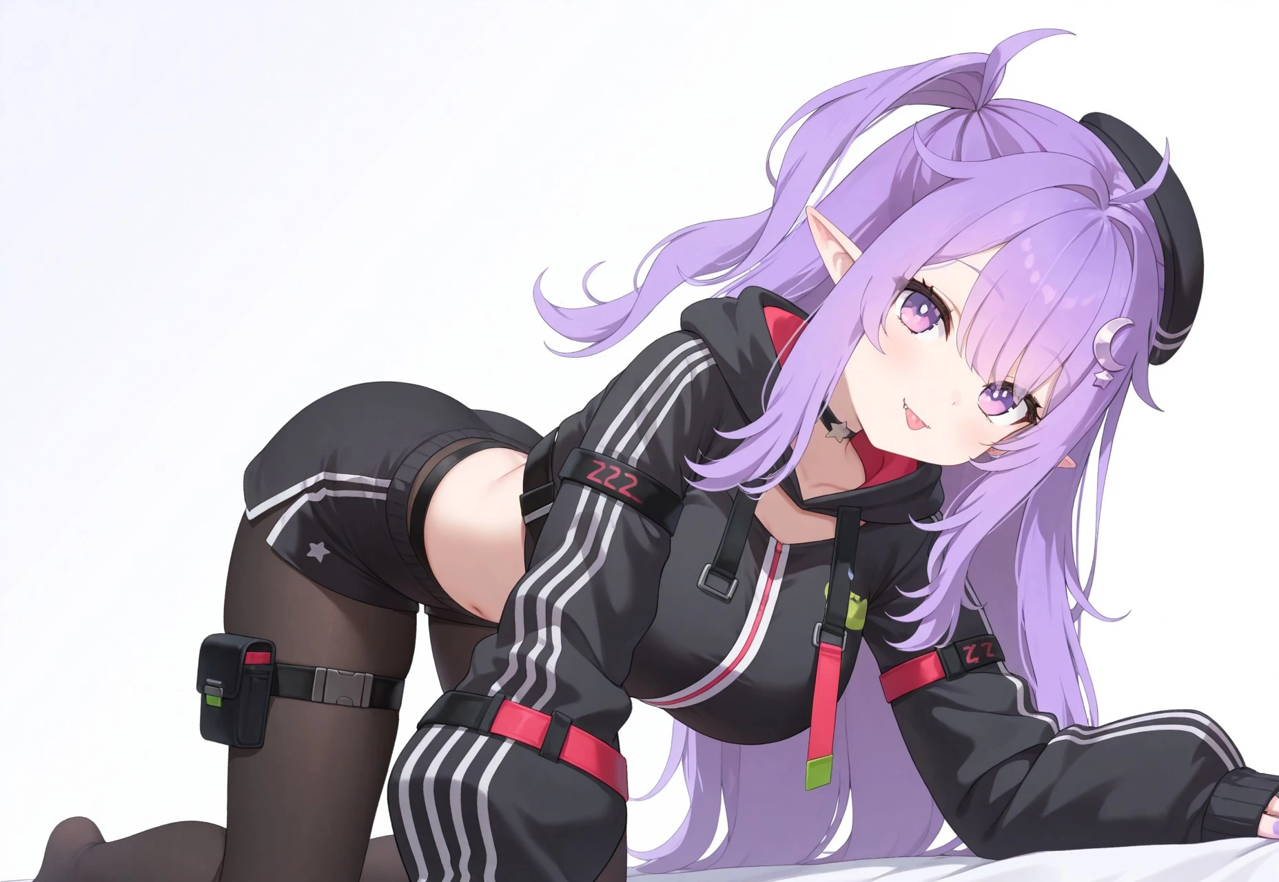 star hair ornament, crescent hair ornament, black choker, star choker, pointy ears,