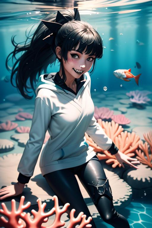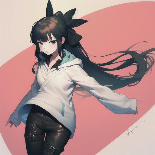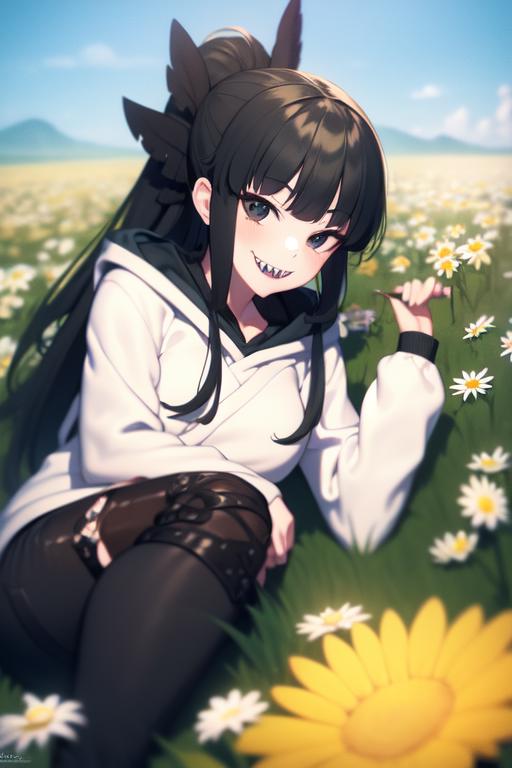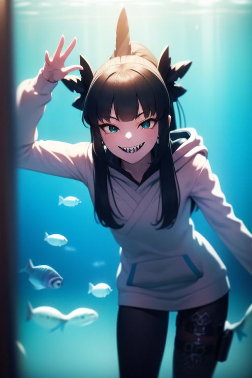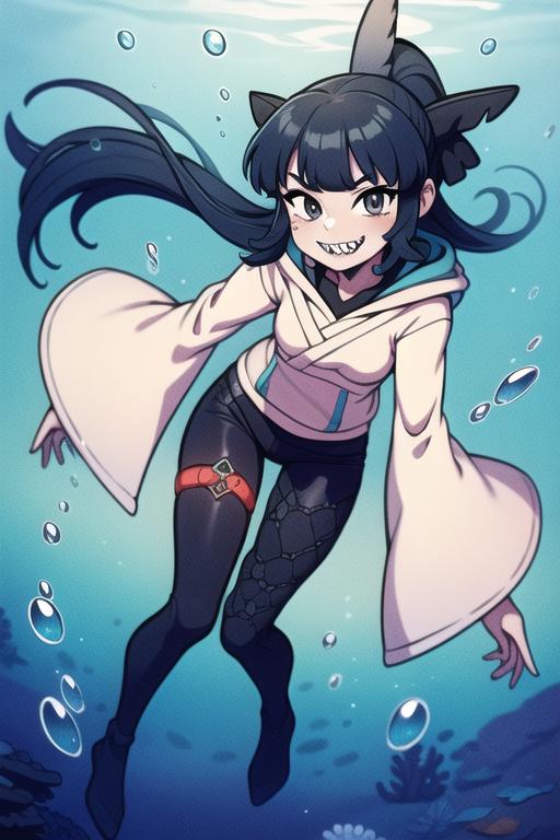 Default outfit: ponytail, white hoodie, long white sleeves, black pants, thigh strap, sharp teeth