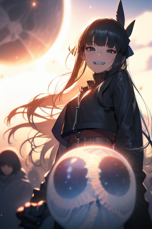 New outfit: zipper, black coat, chain, {{{black vest}}}, long black sleeves, belt, black gloves, sharp teeth