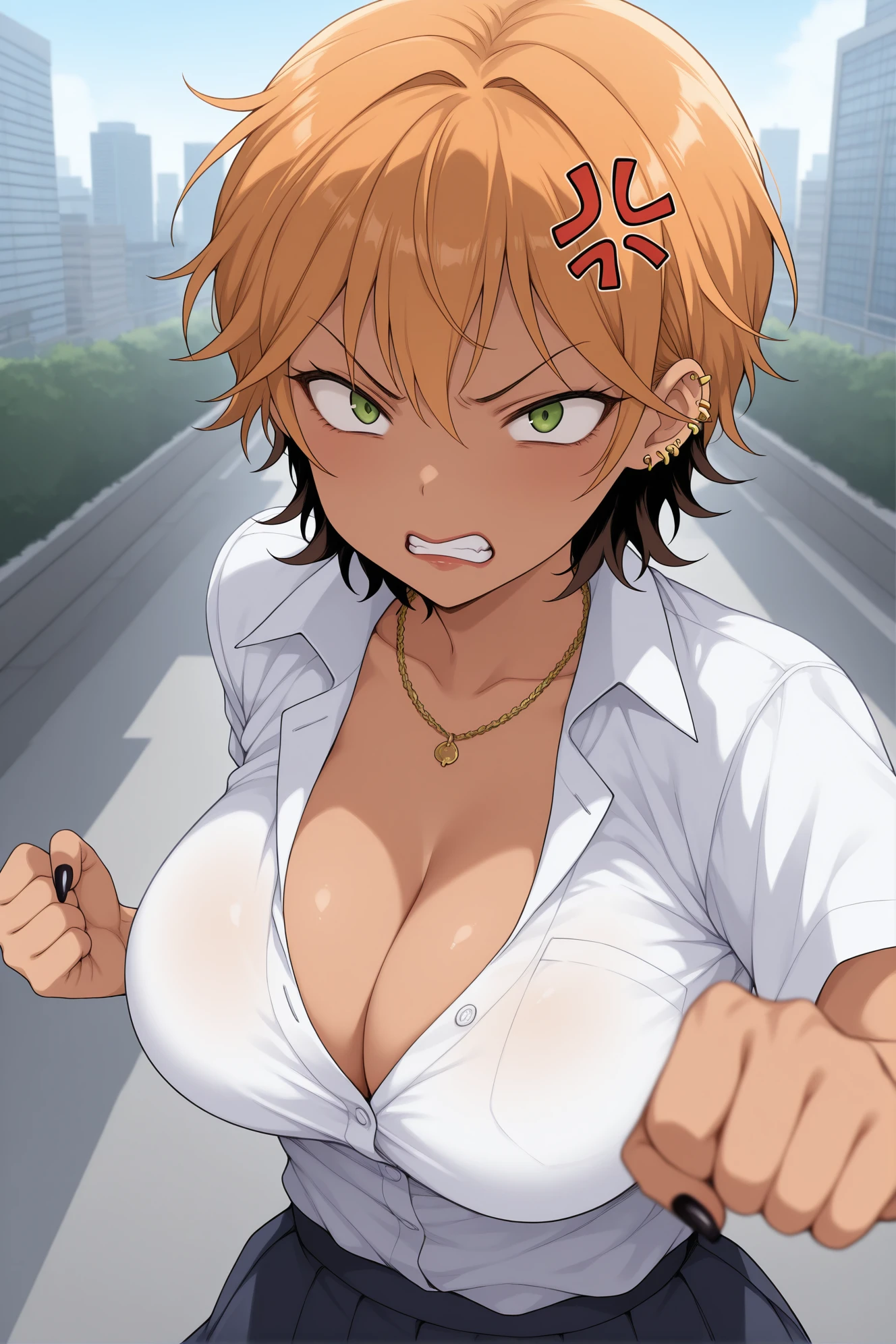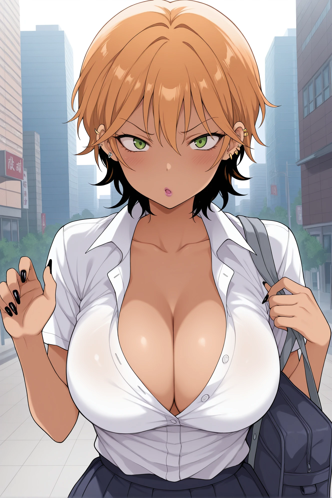 masterpiece,best quality,amazing quality, girlknaco, orange hair,green eyes,short hair,two-tone hair,large breasts,delinquent,gyaru