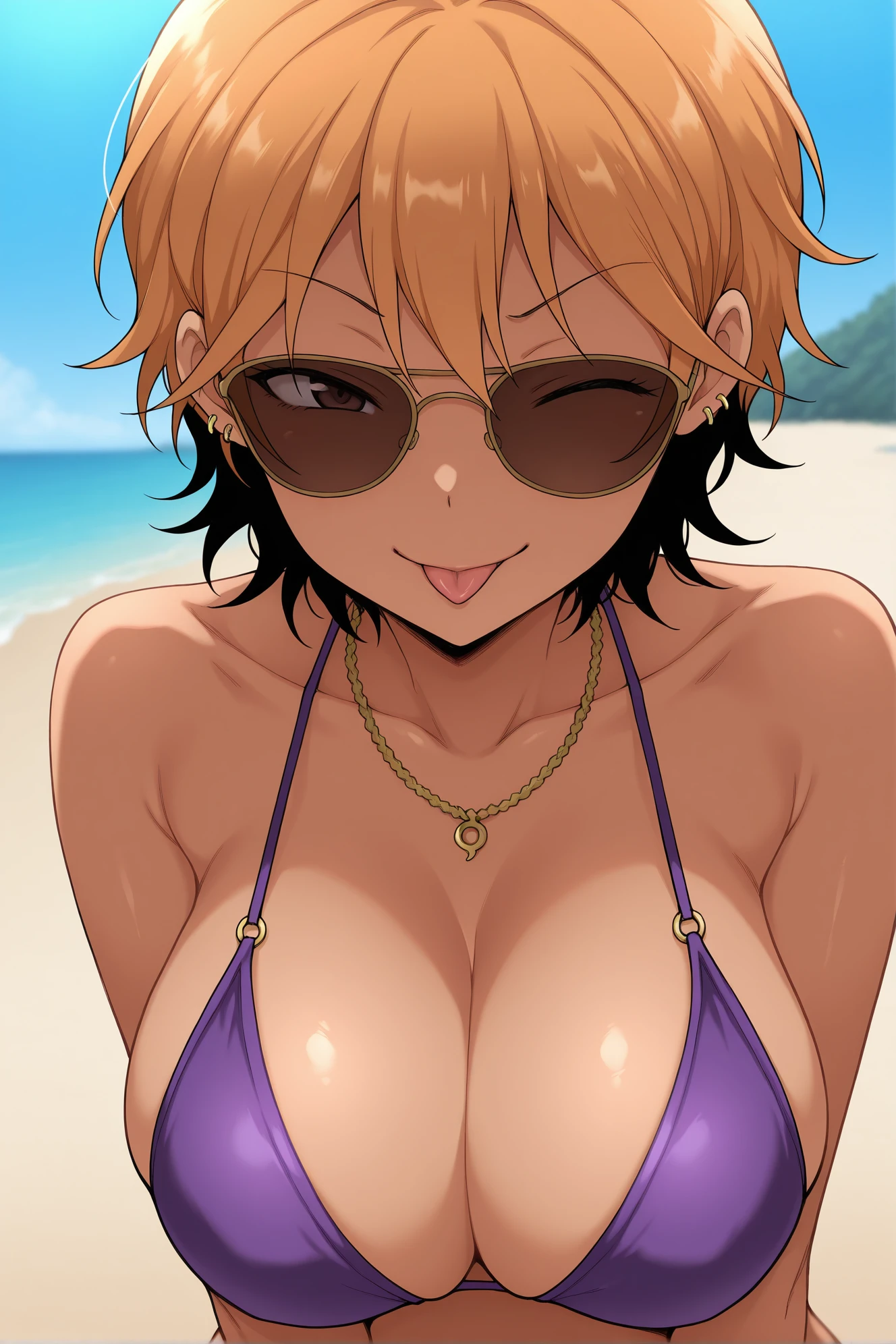 score_9,score_8_up,score_7_up,BREAK girlknaco,short hair,two-tone hair,orange hair,gyaru,ear piercing,green eyes,narrowed eyes