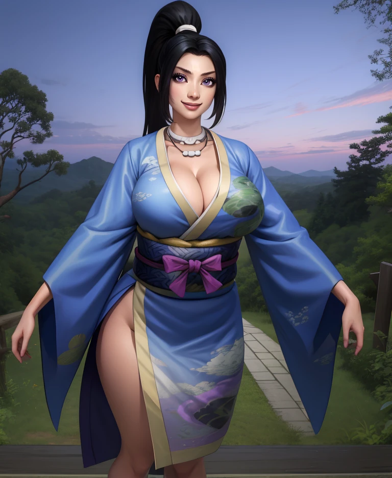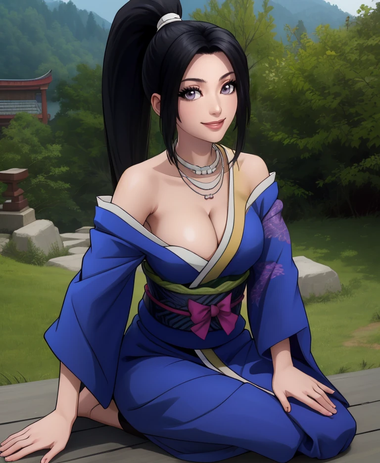 (blue or purple) japanese clothes, or kimono, or robe, cleavage, bare shoulders, - necklace, shoulder armor, detached sleeves, gauntlets,
