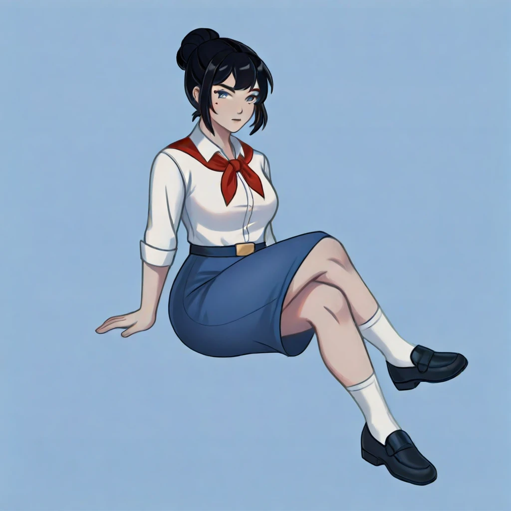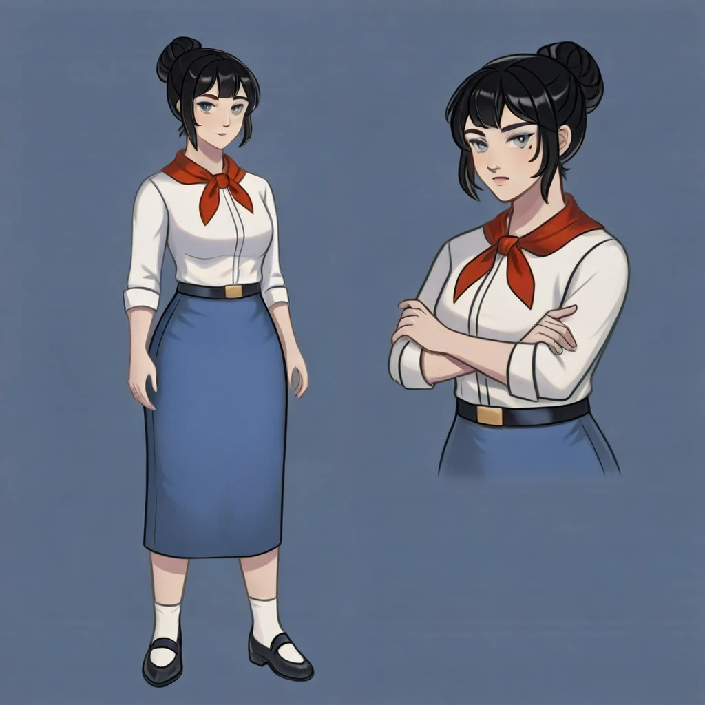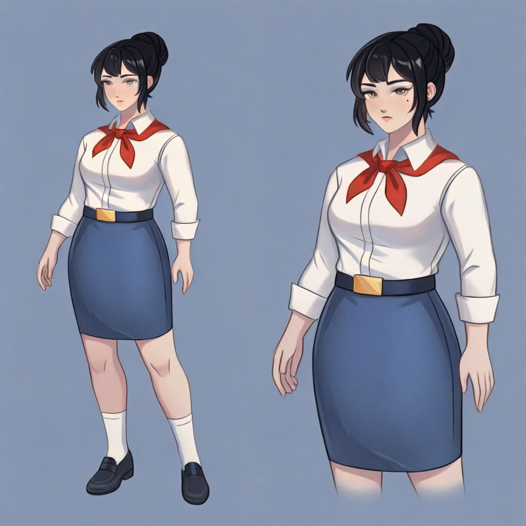black hair, hair bun, grey eyes, mole under eye, belt buckle, white shirt, shirt tucked in, red neckerchief, blue skirt, long skirt, black shoes, white socks, pleated skirt
