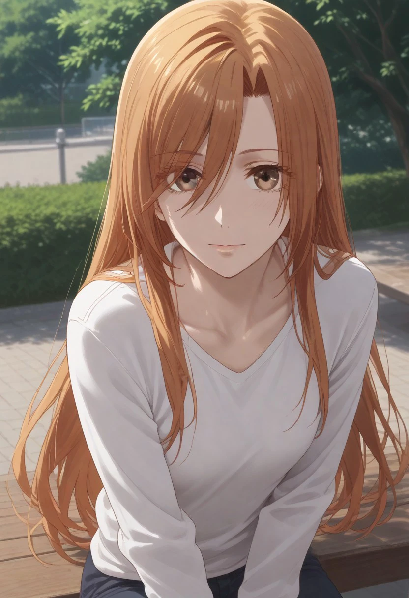 long hair, orange hair, brown eyes, eyes visible through hair, hair between eyes, bangs,