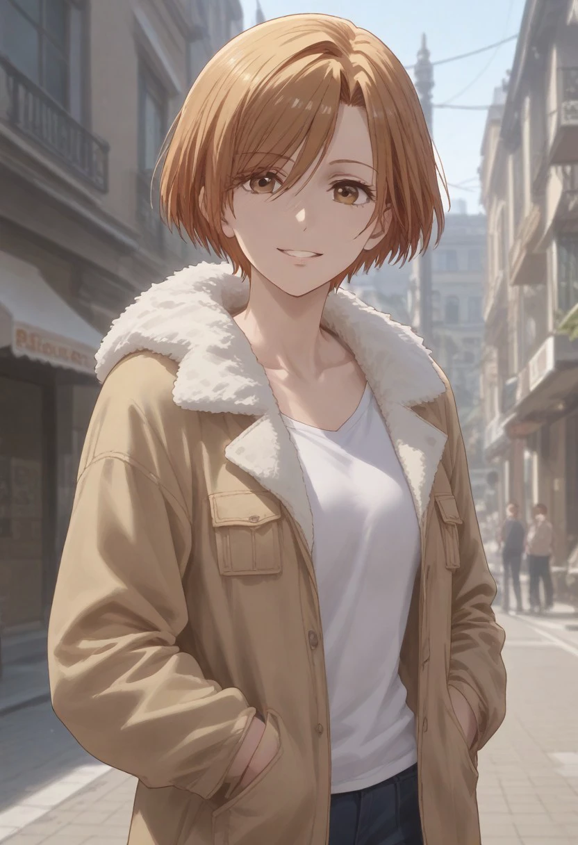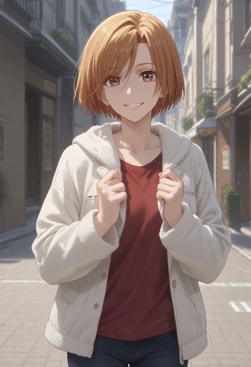 short hair, brown eyes, orange hair, bangs,