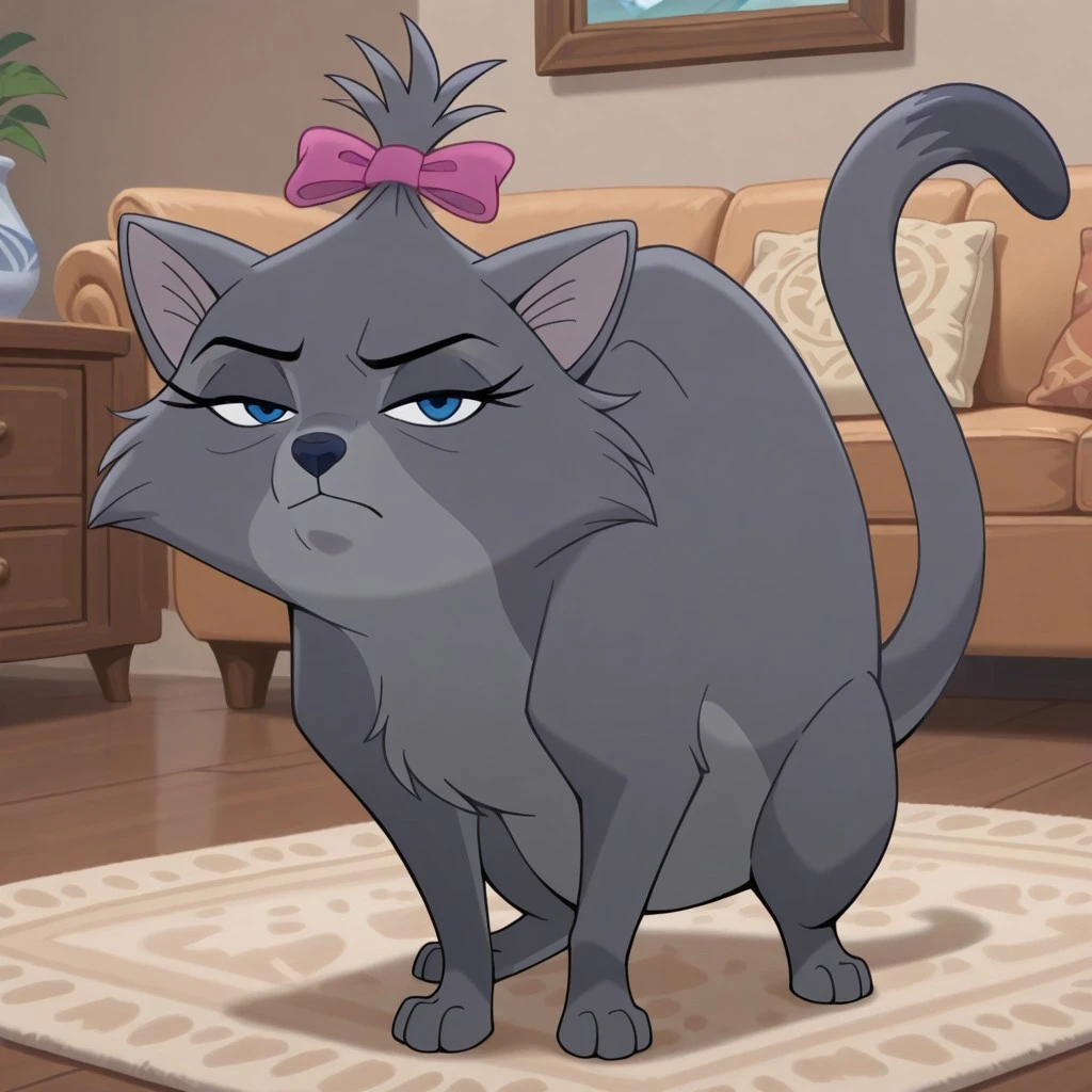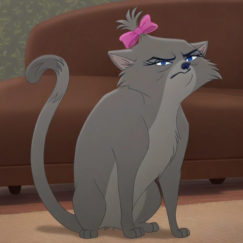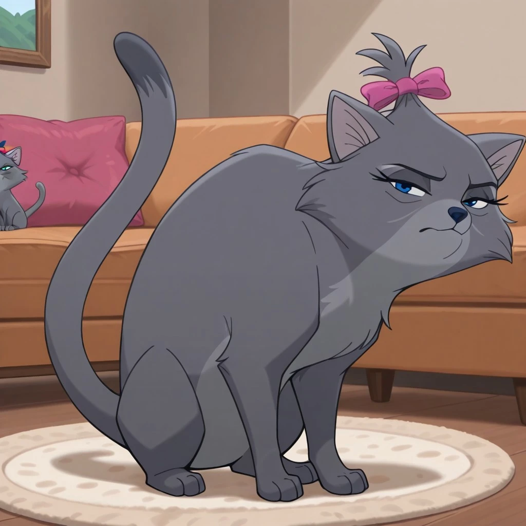 cat, gray fur, blue eyes, eyelashes, black nose, cat tail, pink bow, hair bow,
