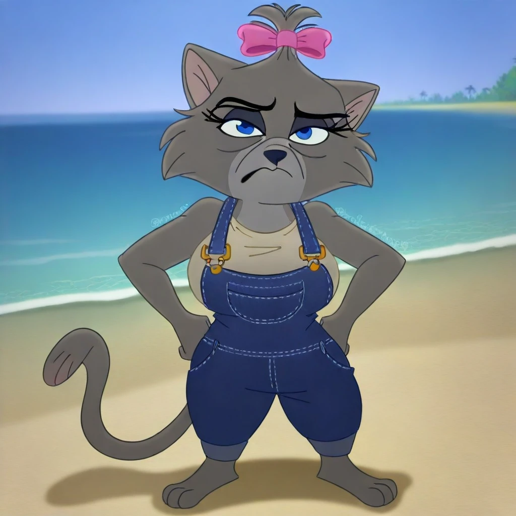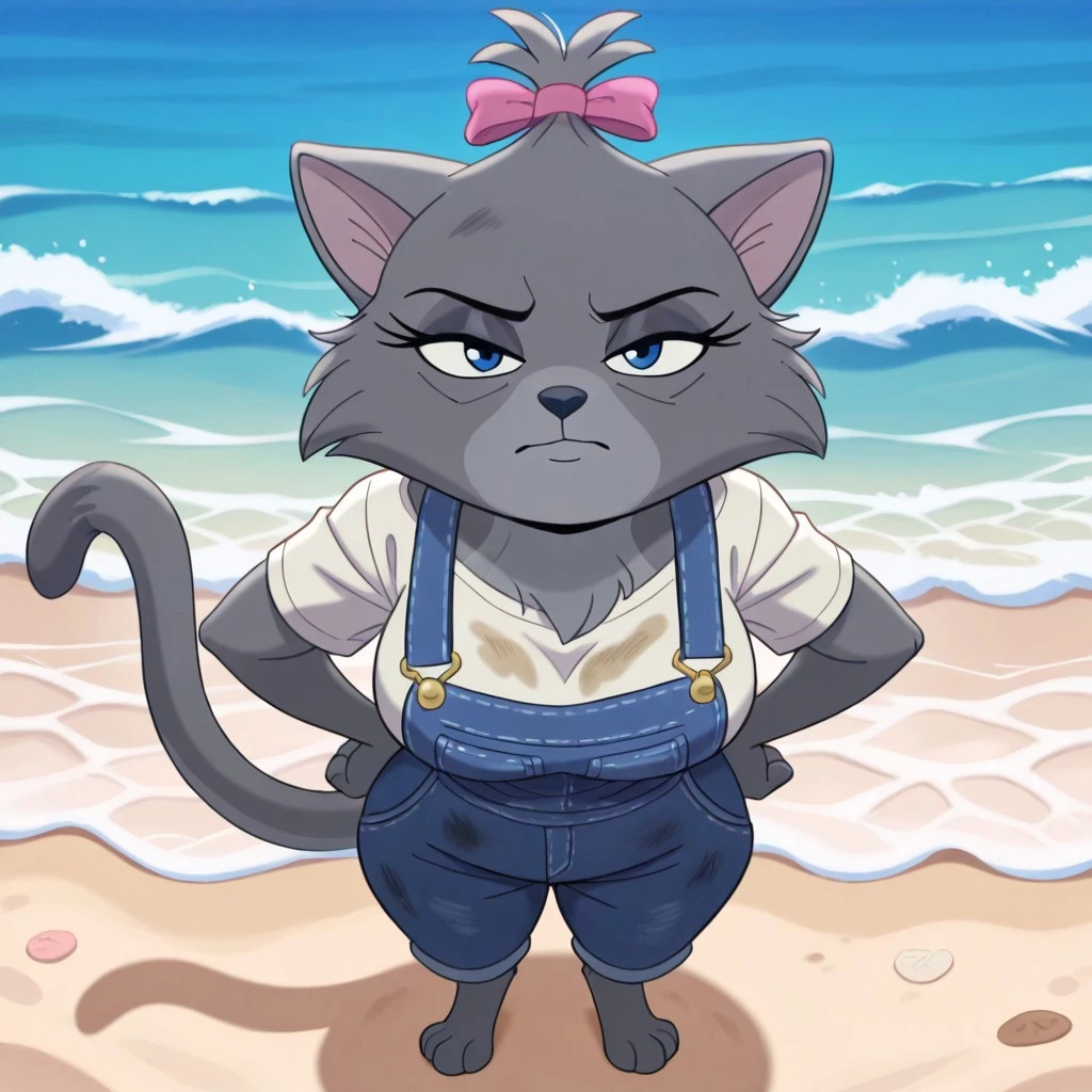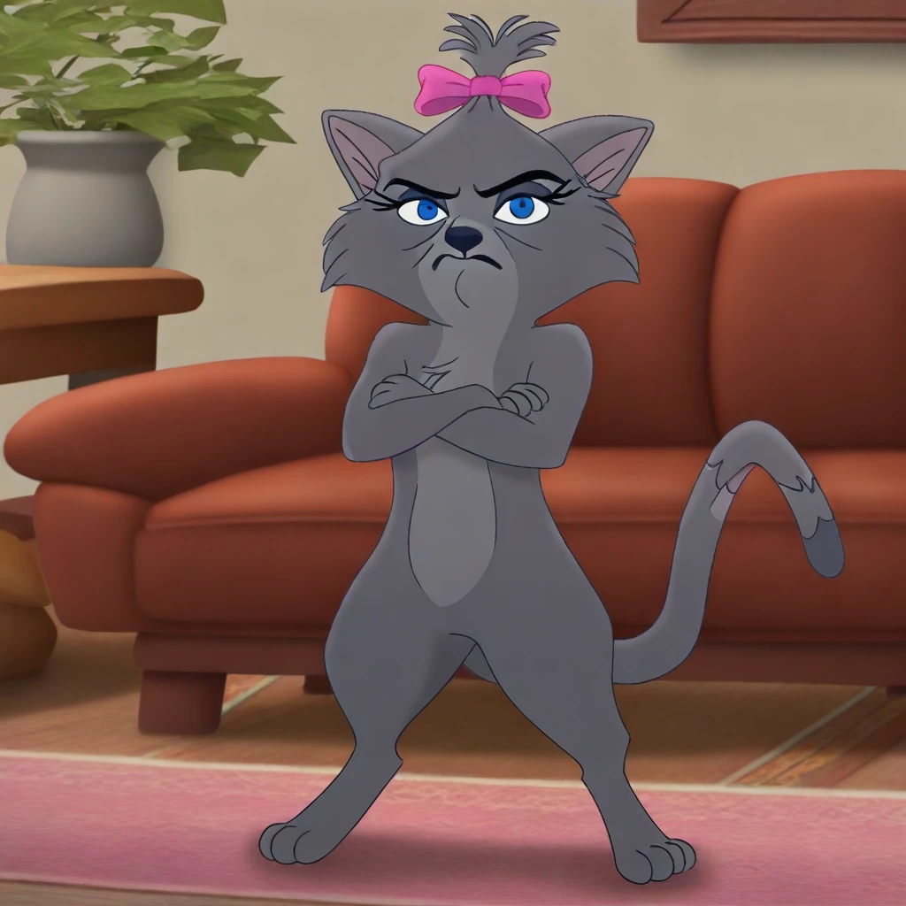cat, gray fur, blue eyes, eyelashes, black nose, cat tail, pink bow, hair bow,