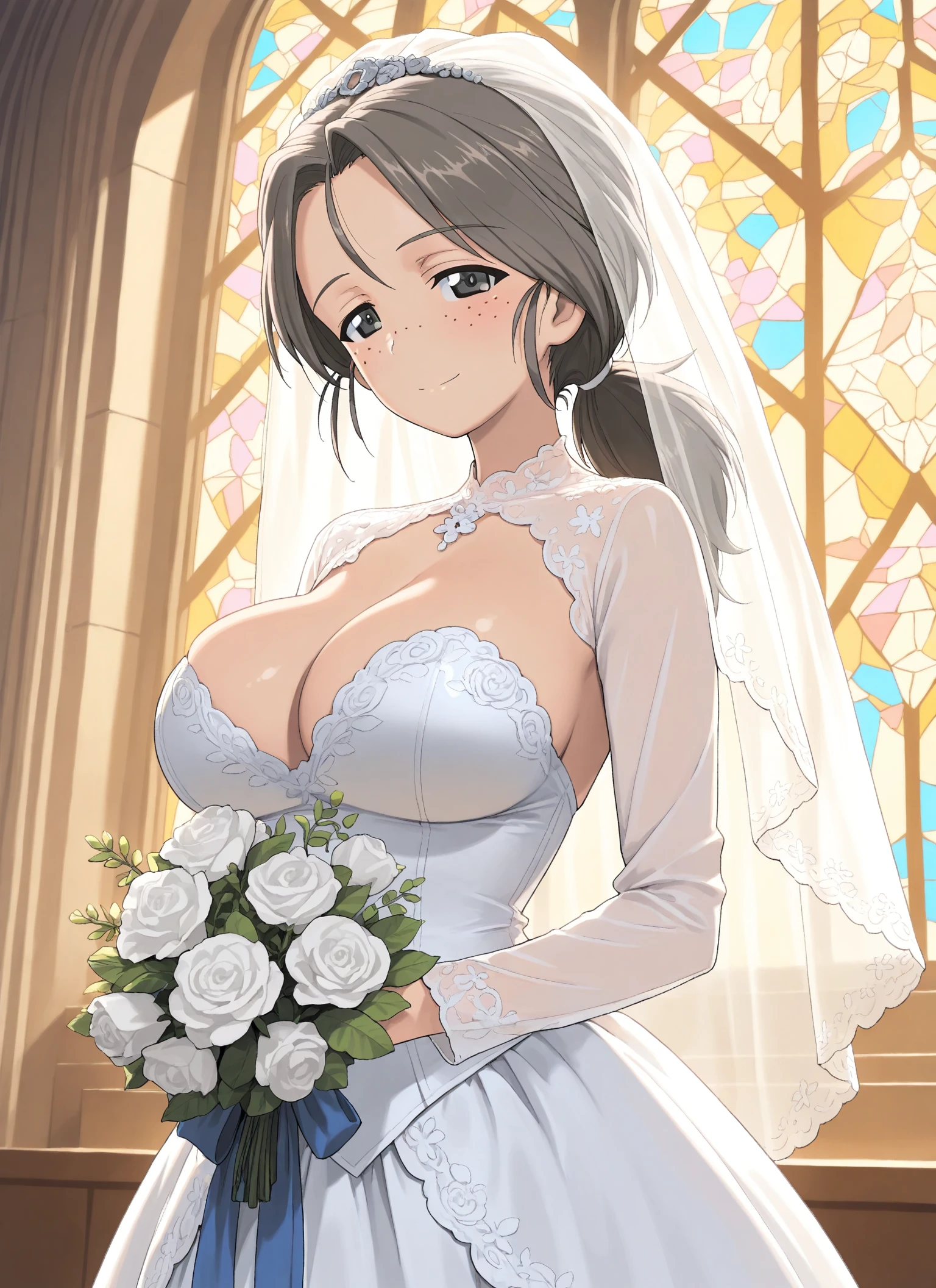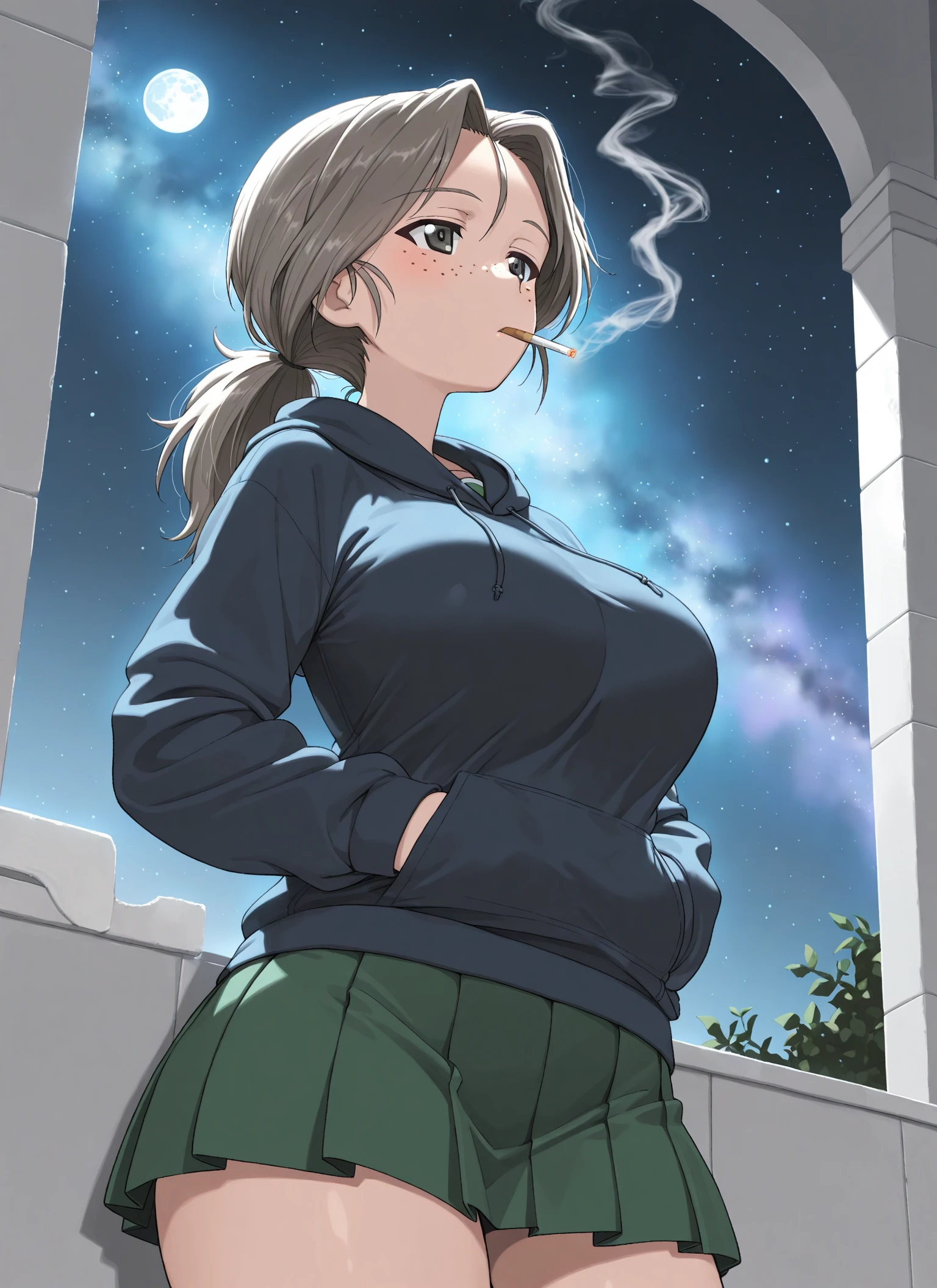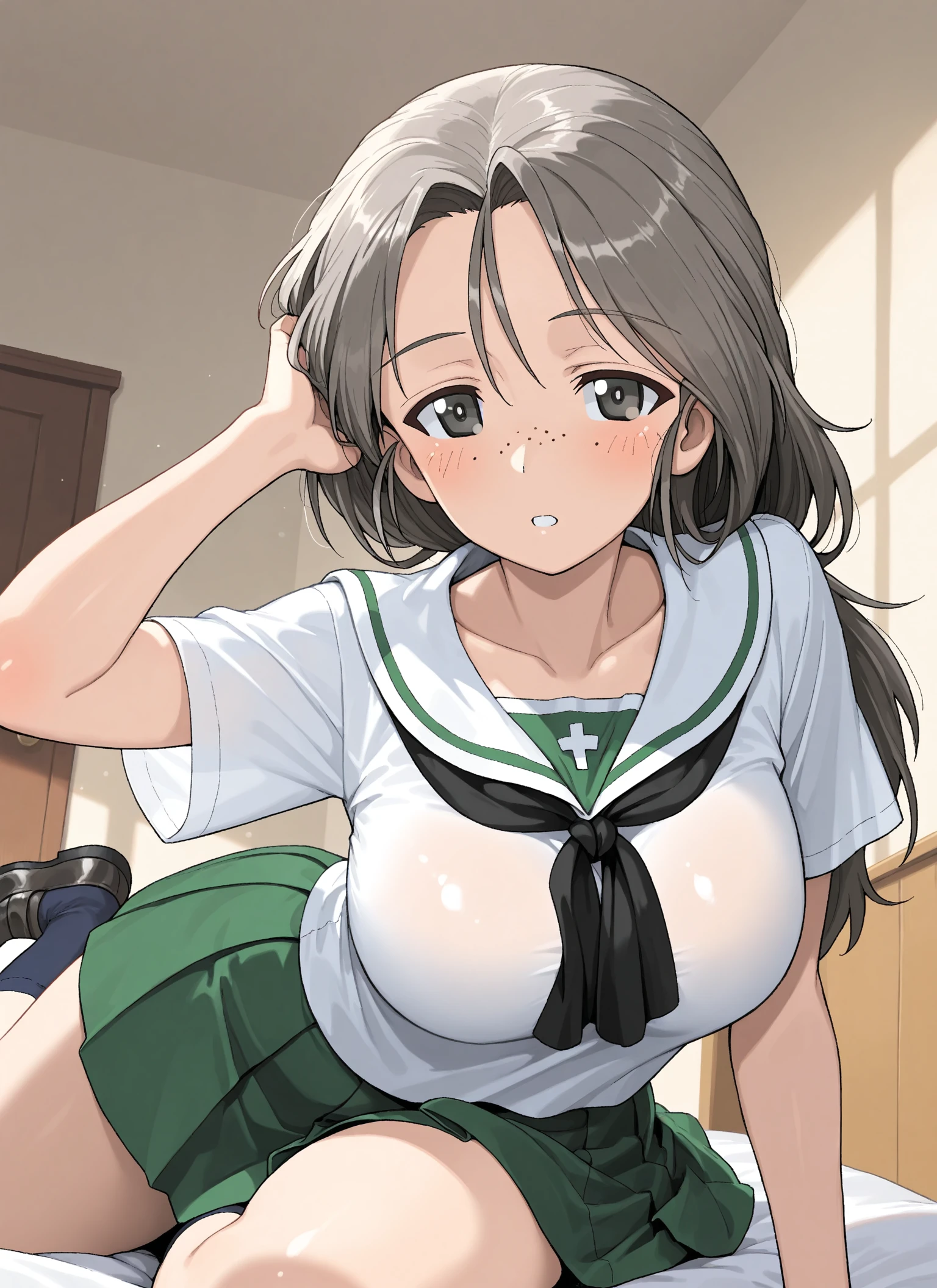 1girl, solo, Piyotan (Girls Und Panzer), grey hair, long hair, ponytail, freckles, grey eyes, large breasts,