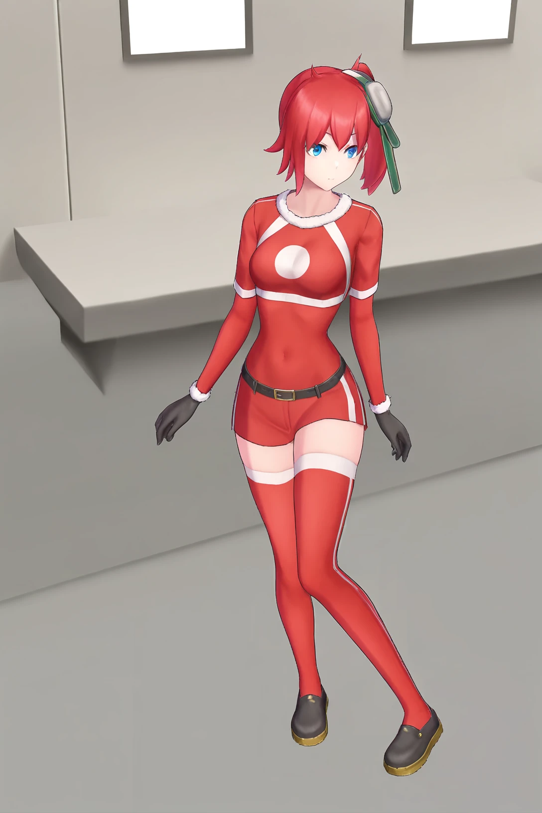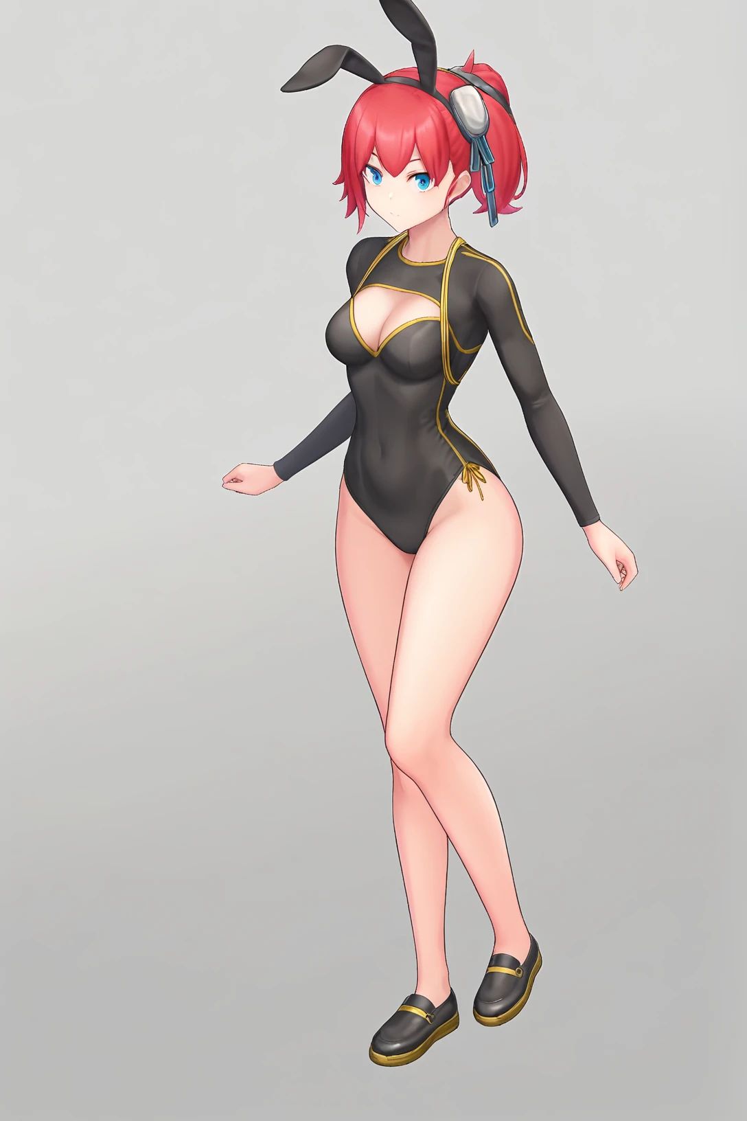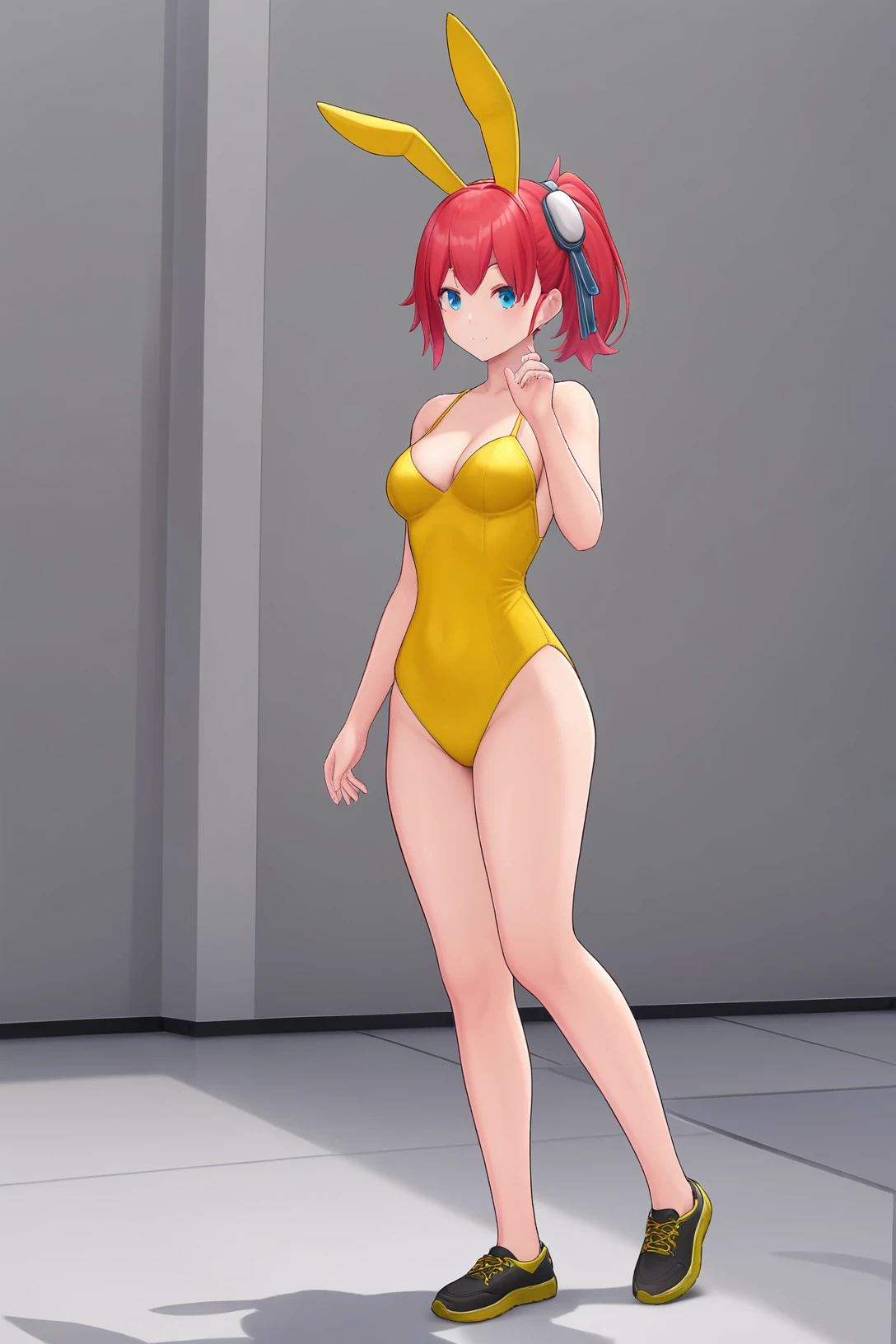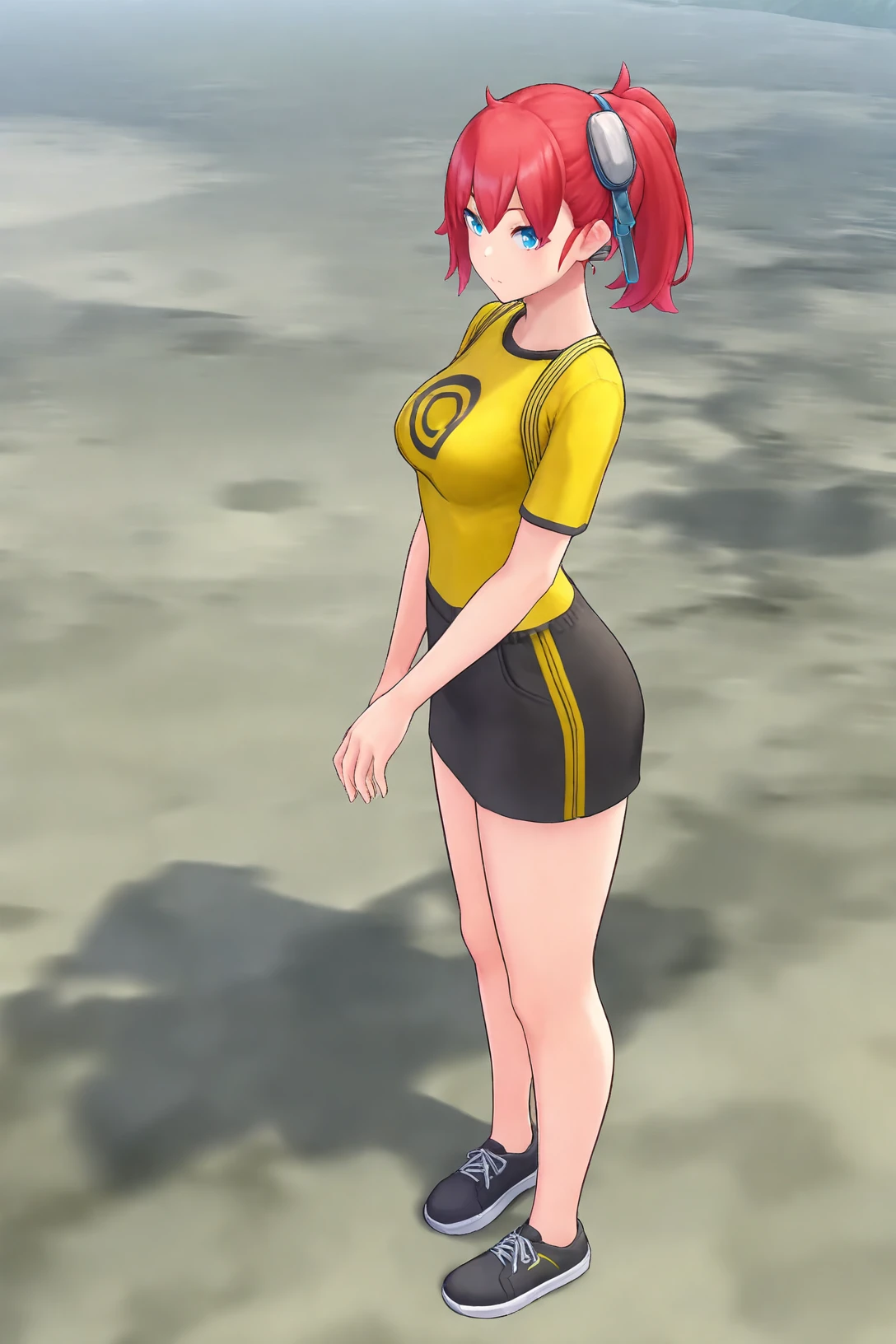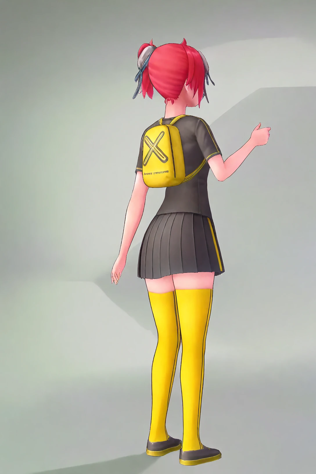 dsc-ami, yellow shirt, yellow backpack, yellow thighhighs, black skirt, black shirt, gloves, single glove, school uniform, hair ornament
