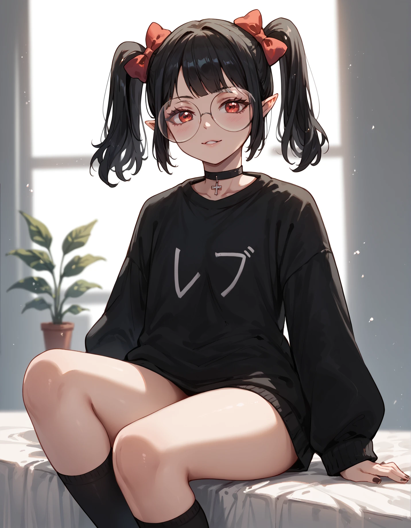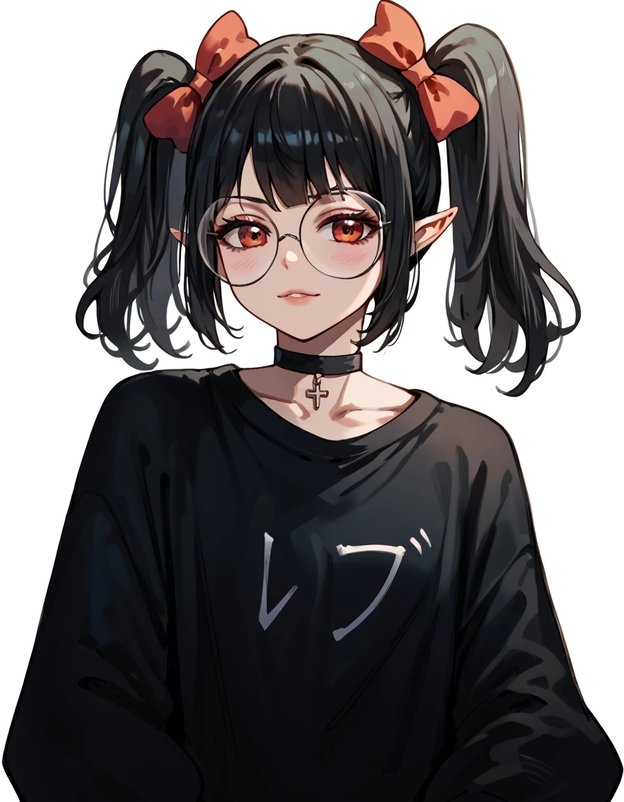 ,revmodel, 1girl, black hair, twintails, bow, hair bow, red eyes, pointy ears, black choker, round eyewear