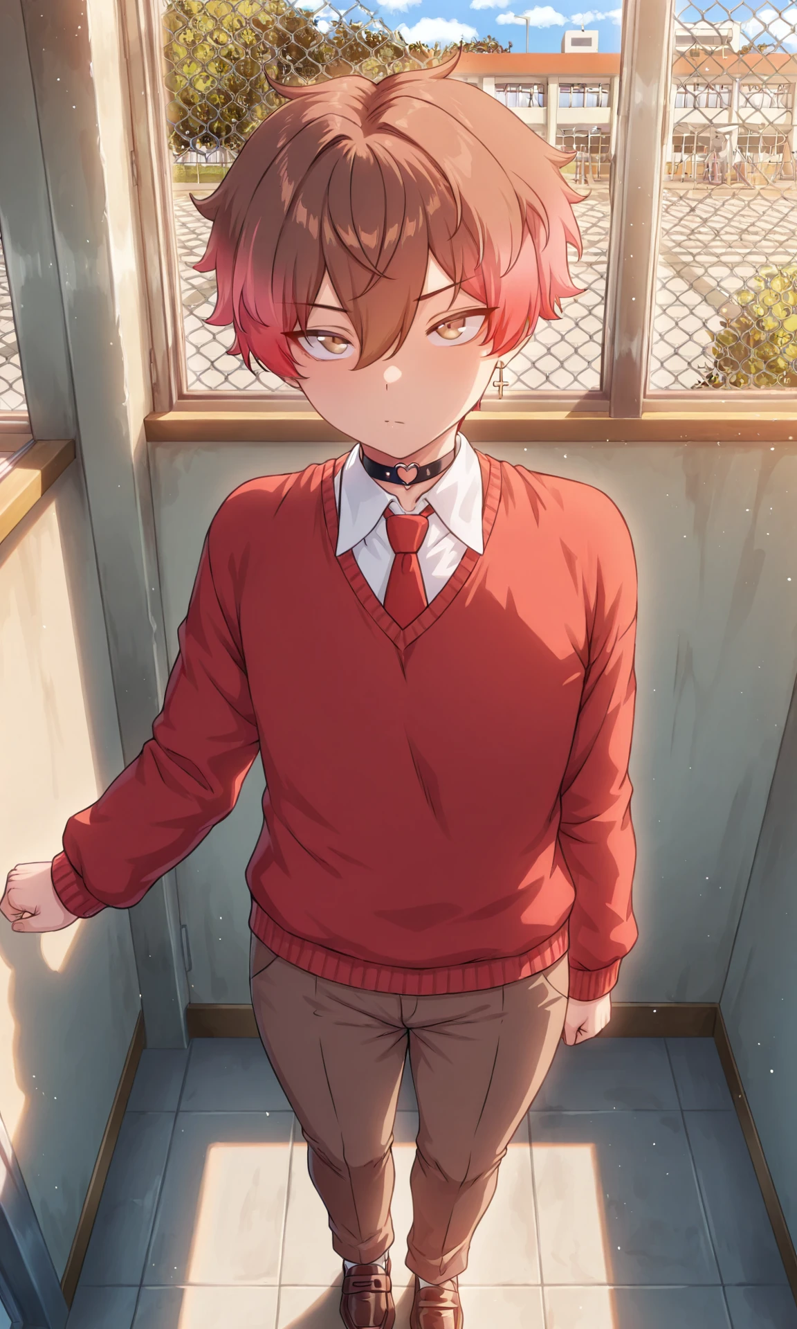 Prompts Outfit (scholar): school uniform, necktie, red necktie, collared shirt, white shirt, sweater, red sweater, pants, brown pants, shoes, brown shoes,