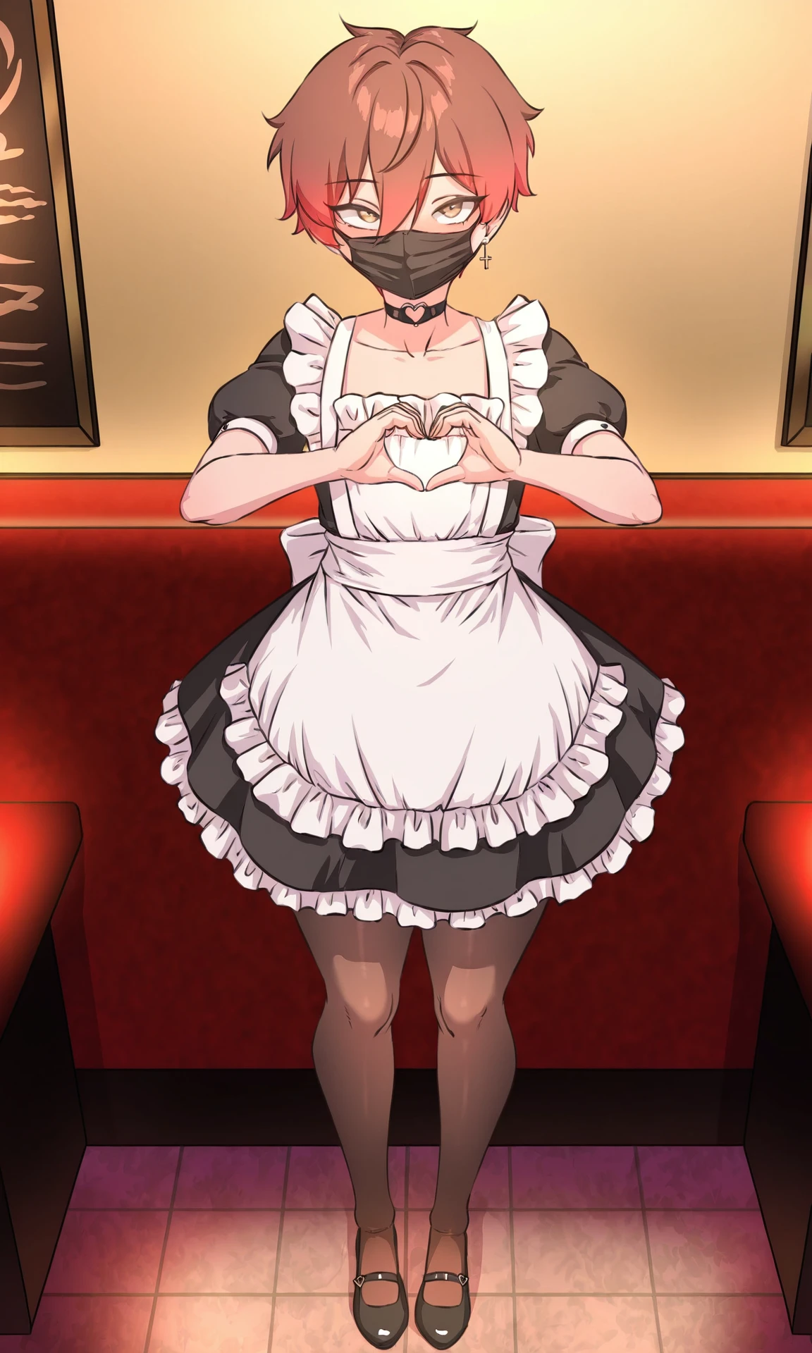 Optional outfit (otoko no ko 2): otoko no ko, crossdressing, maid, enmaided, apron, maid apron, white apron, black bow, black dress, short sleeves, puffy sleeves, puffy short sleeves, pantyhose, frills, frilled dress, mask, mouth mask, black mask,