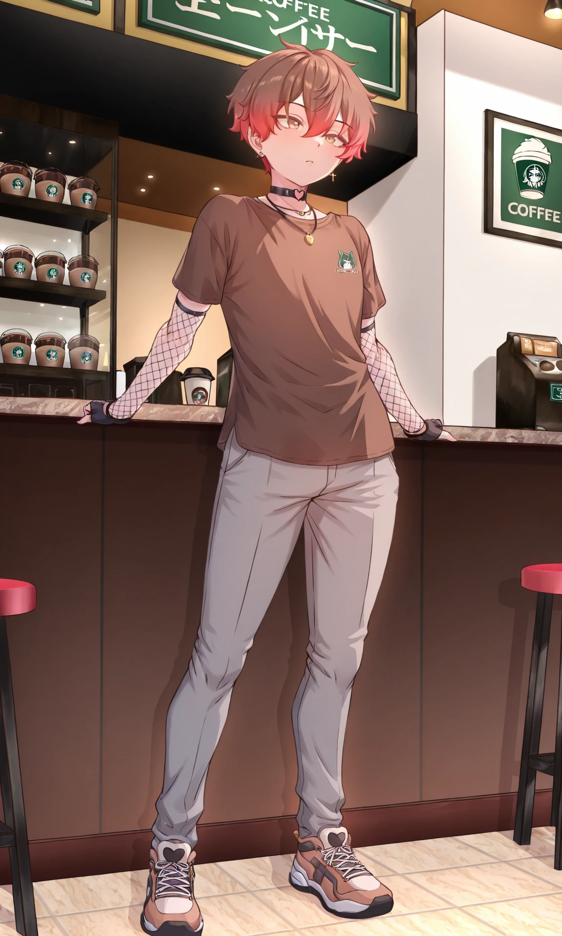 Prompts Outfit (base): necklace, shirt, brown shirt, short sleeves, fishnets, fishnet gloves, elbow gloves, fingerless gloves, grey pants, shoes,