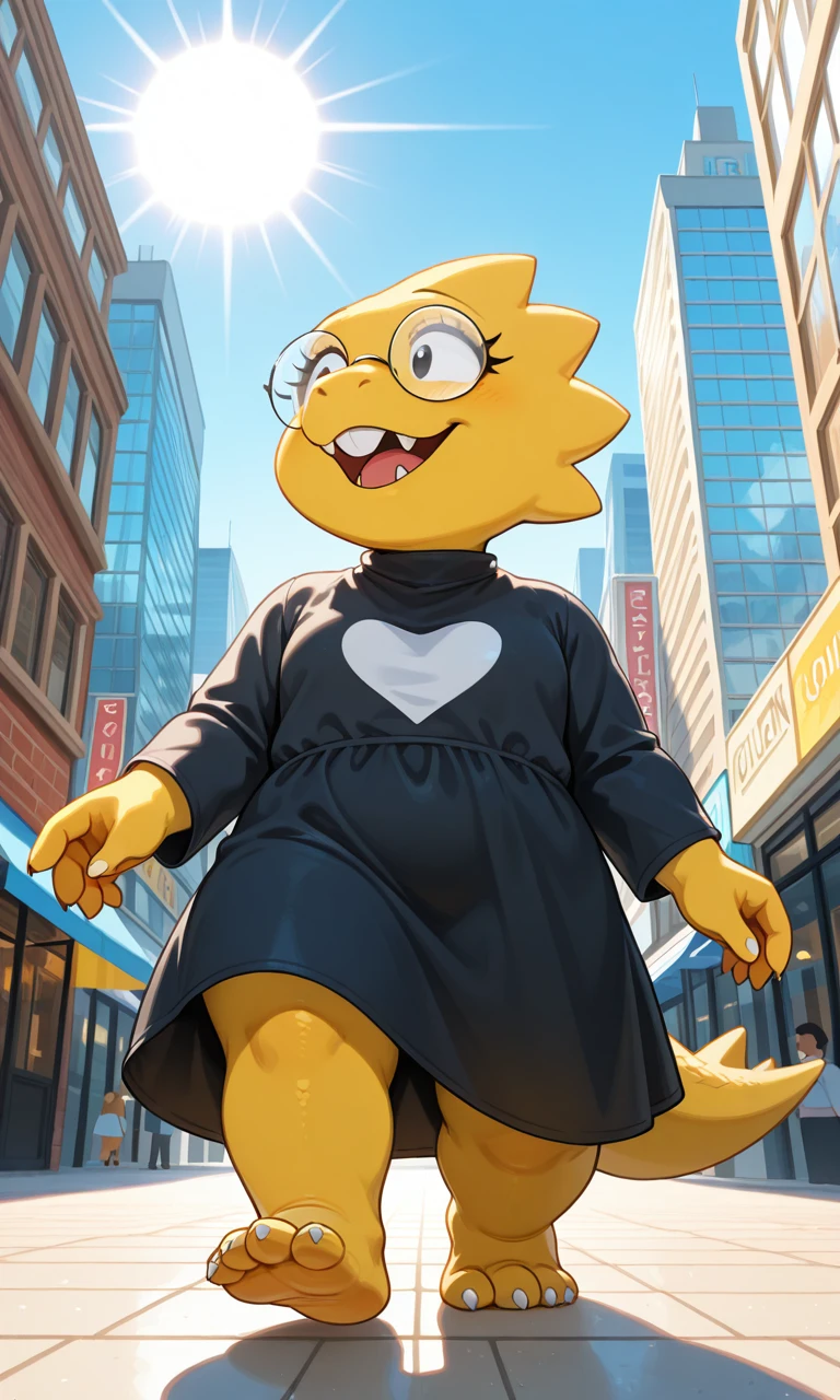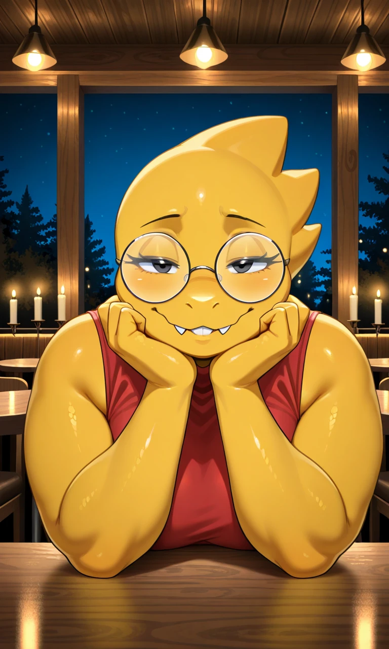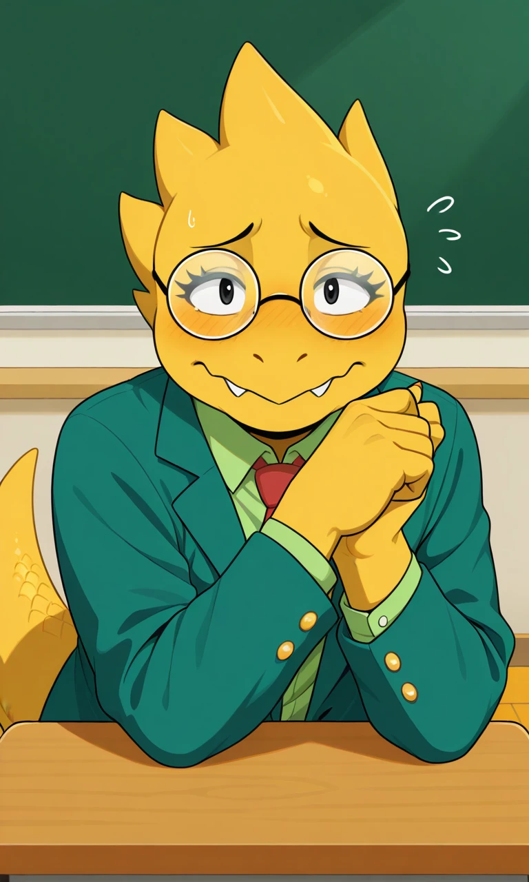 Alphys_(undertale), anthro reptile, yellow skin, scales, black eyes, eyelashes