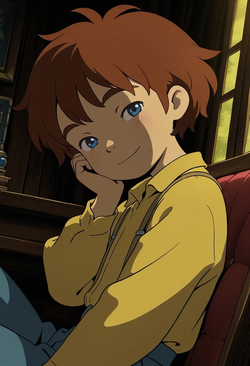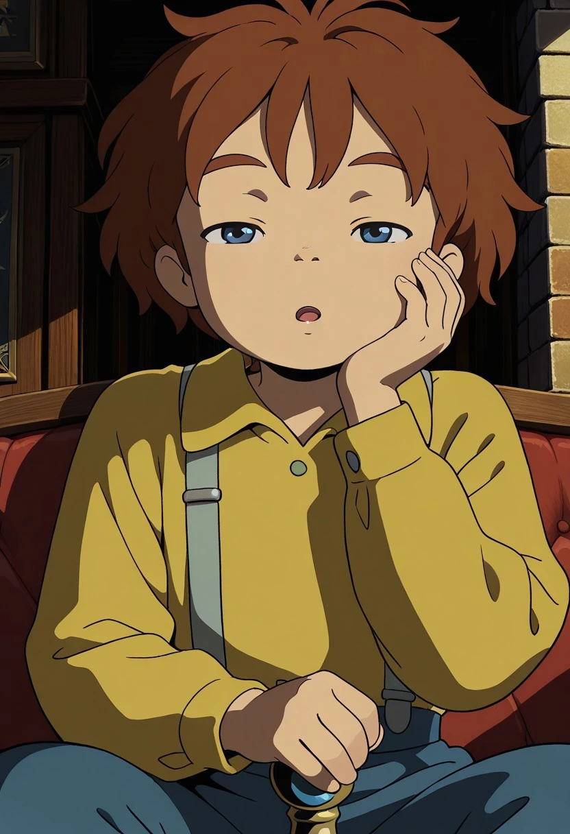 1boy,solo,Oliver,brown hair,blue eyes,yellow shirt,suspenders,pants,socks,shoes