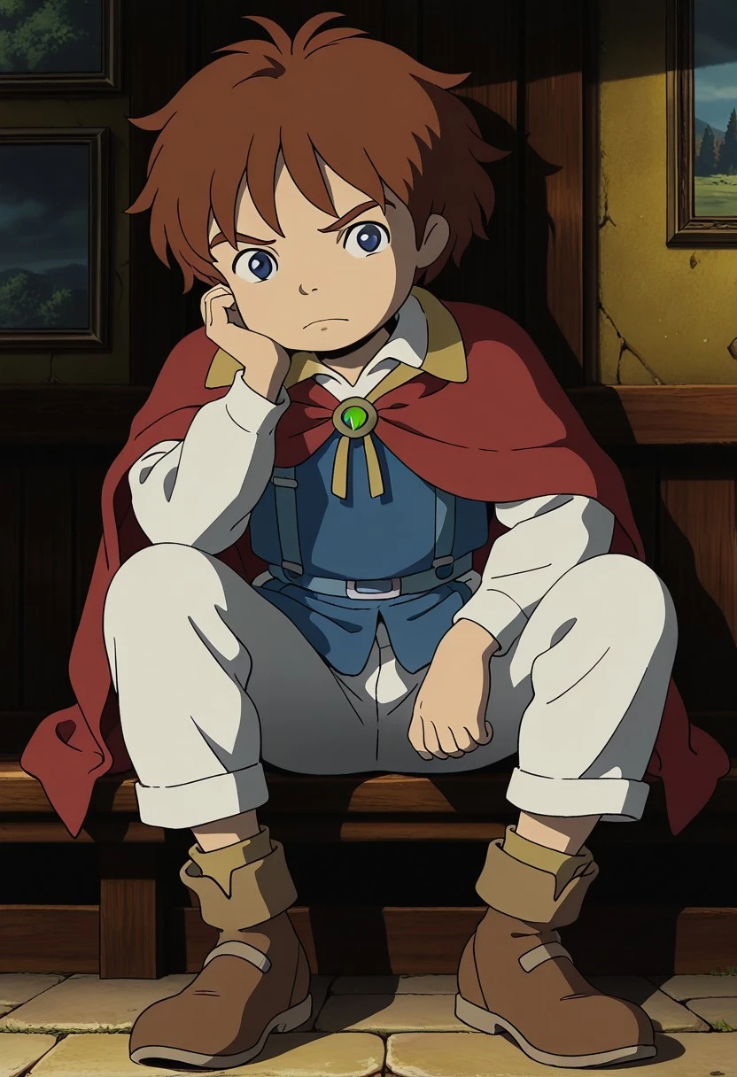 Outfit: blue vest over a white shirt,white pants,red cape.brown footwear