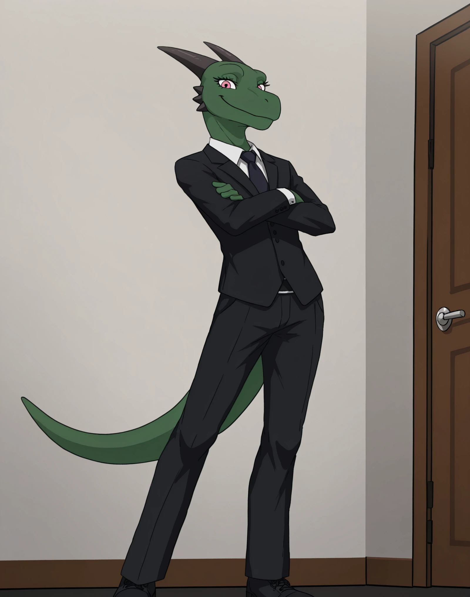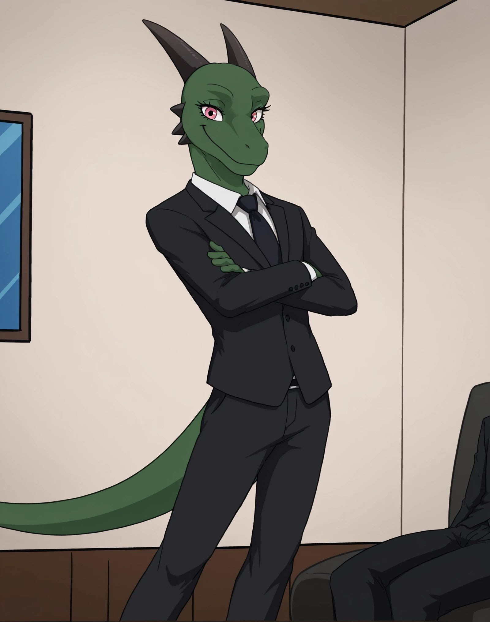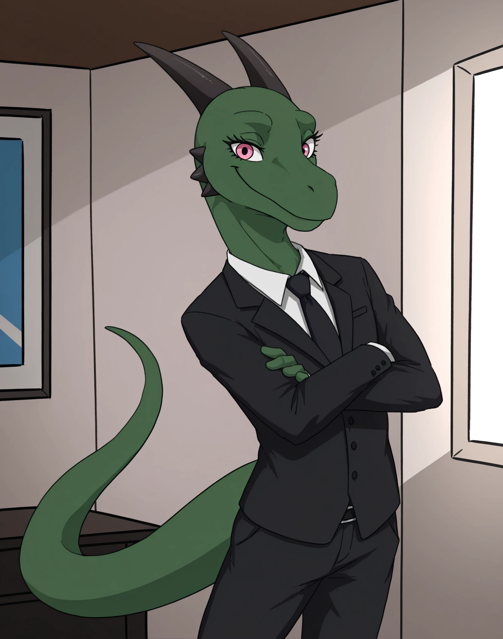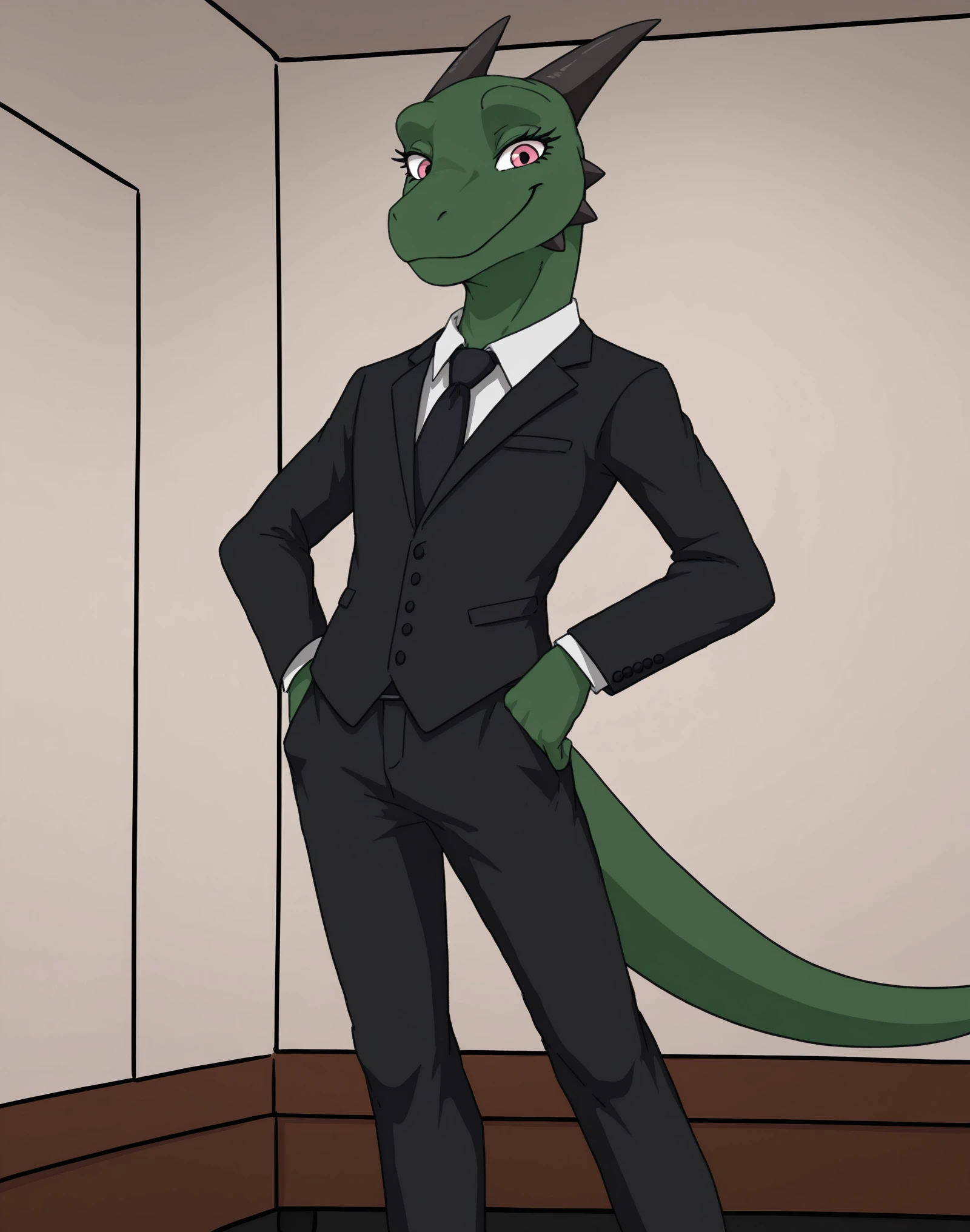 MrMellowCJIS, male, reptile, green skin, pink eyes, eyelashes, horns, tail, long tail