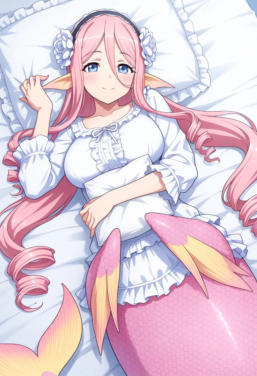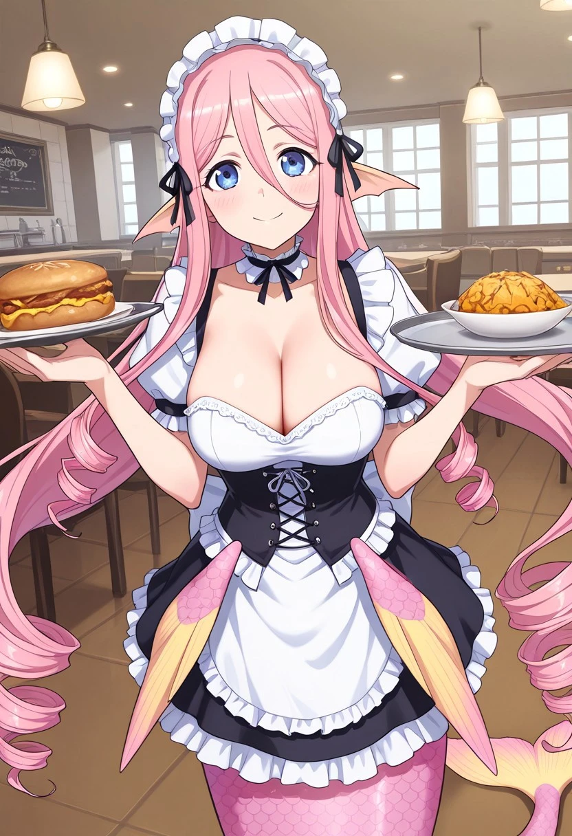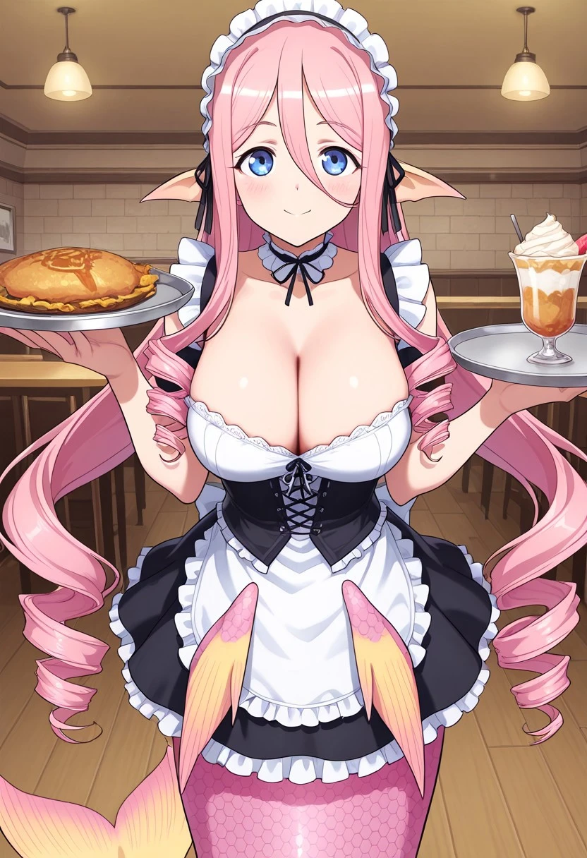 Main tags: mmMeroune, pink hair, very long hair, drill hair, ringlets, blue eyes, monster girl, mermaid, mermaid tail, pink tail, scales, head fins, pointy ears, large breasts, webbed hands