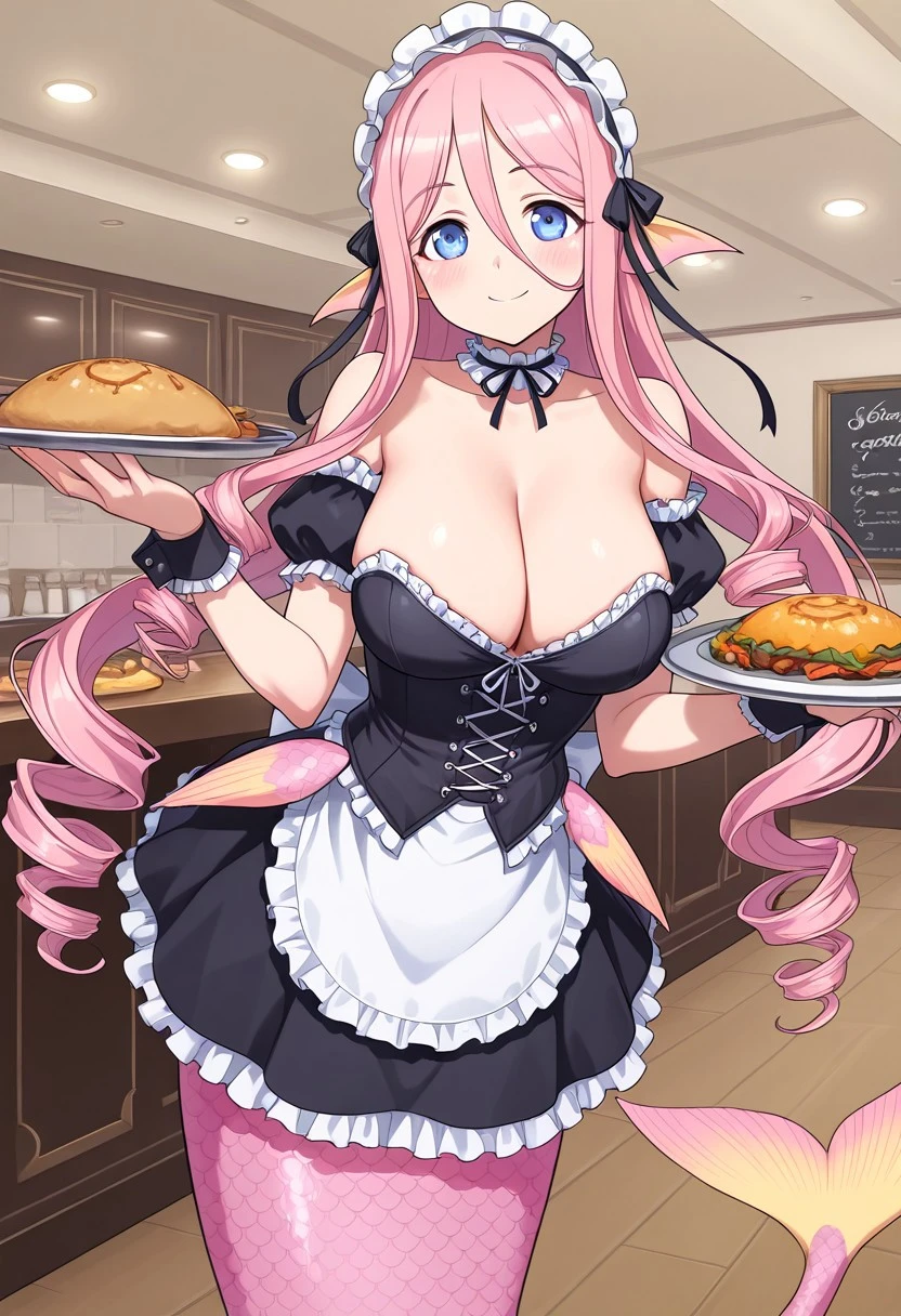 mmMeroune, pink hair, very long hair, drill hair, ringlets, blue eyes, monster girl, mermaid, mermaid tail, pink tail, scales, head fins, pointy ears, large breasts, (webbed hands)