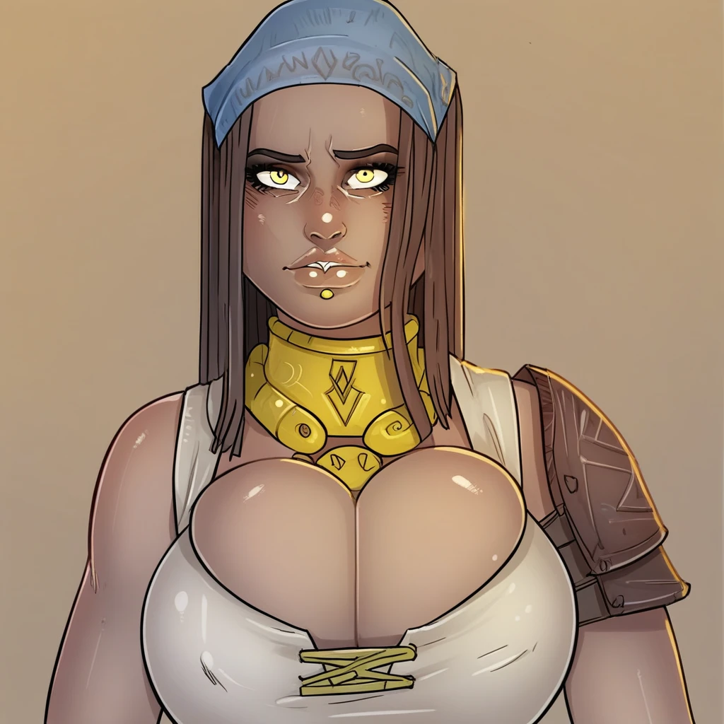 Isabela, dark-skinned female, huge breasts, necklace, dark hair, blue kerchief, amber eyes,