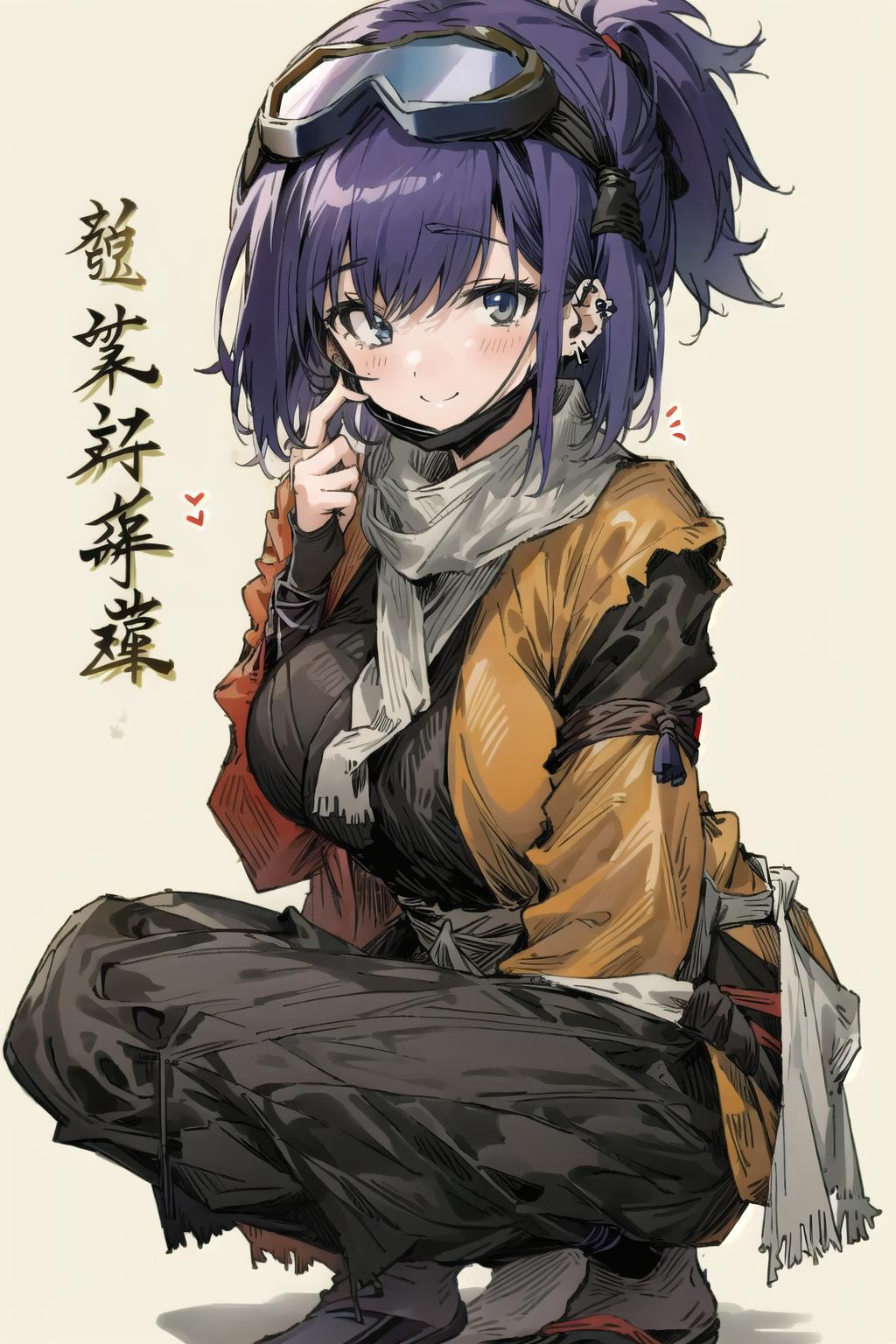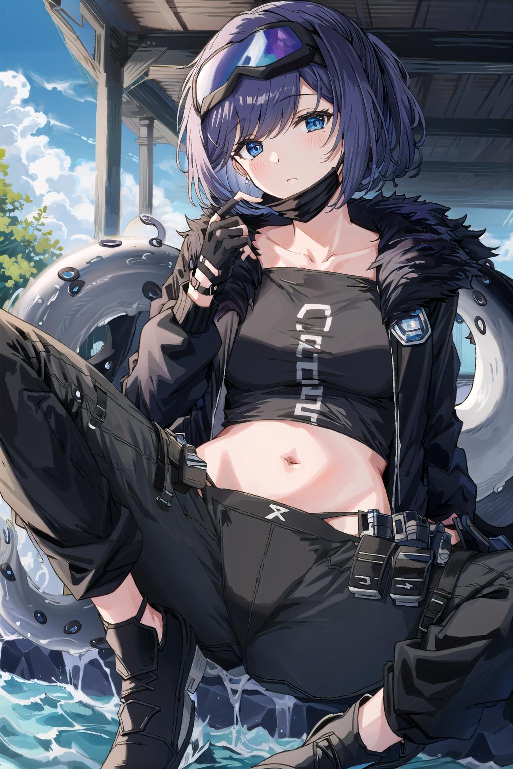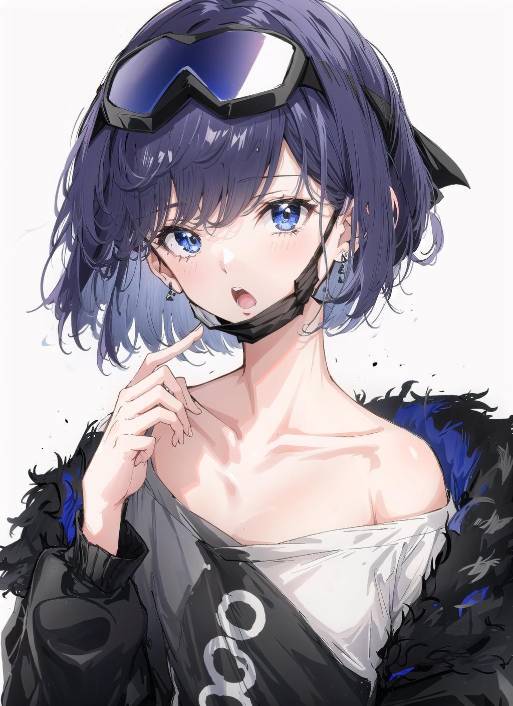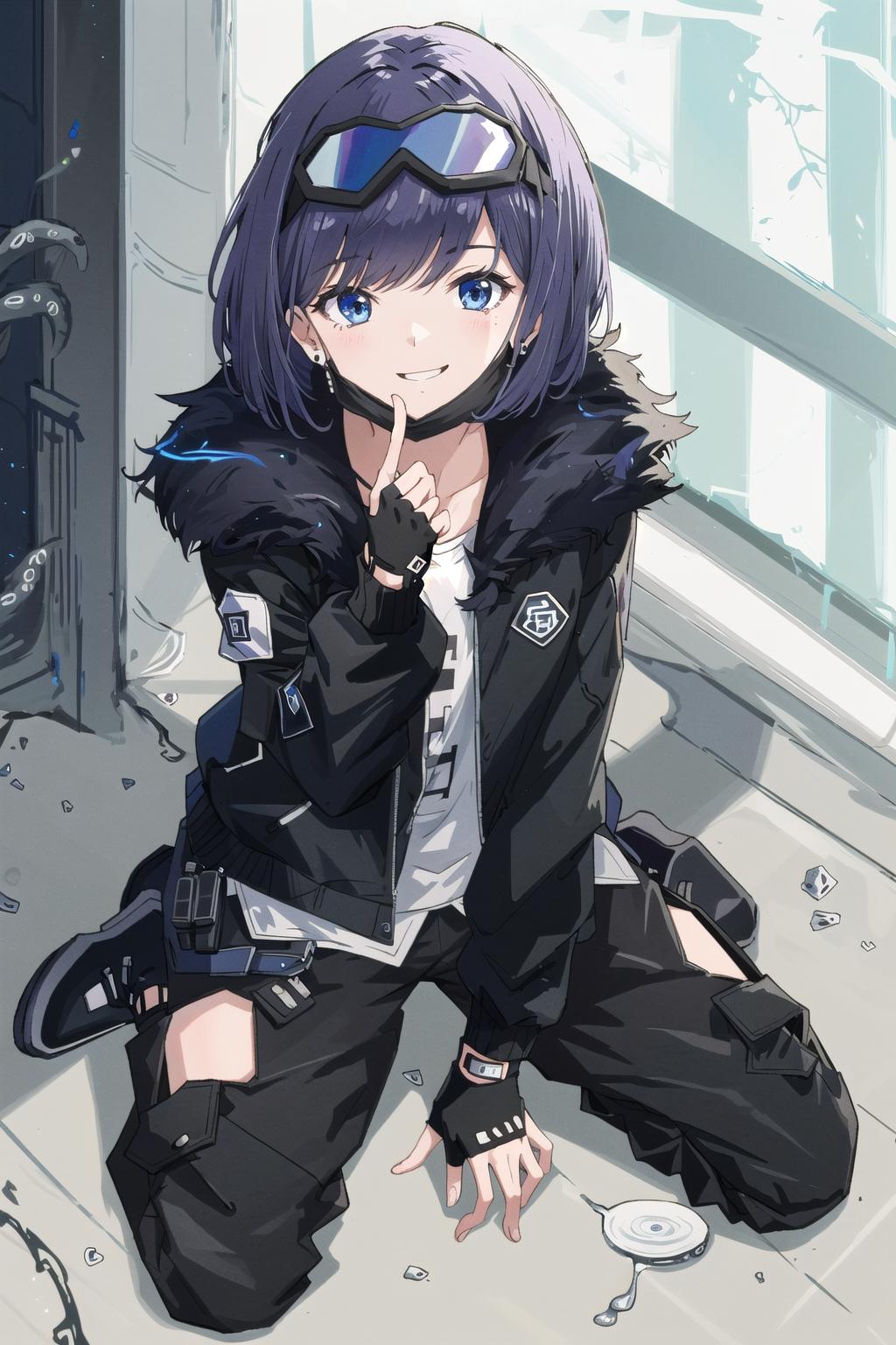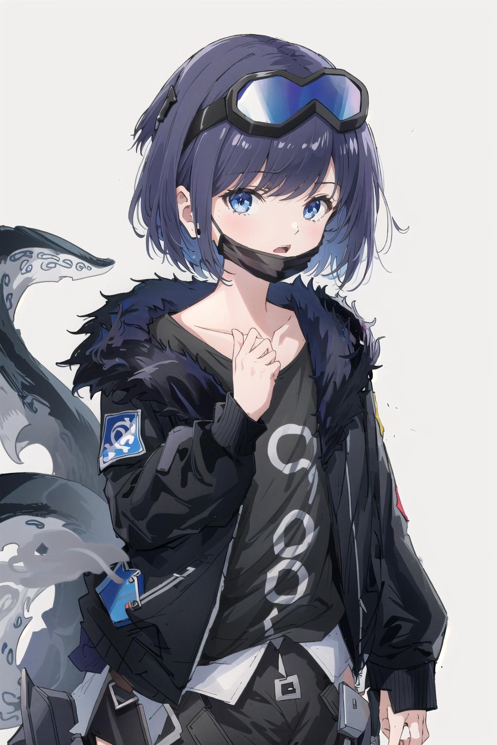 mask,shirt,fur-trimmed jacket,open clothes, fingerless gloves, open jacket, black shirt