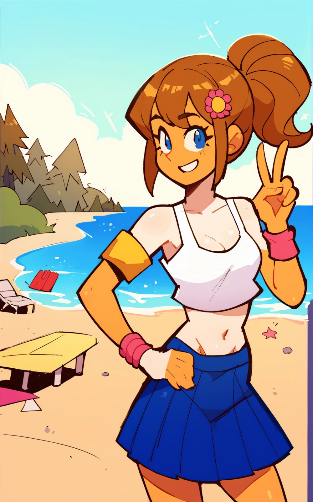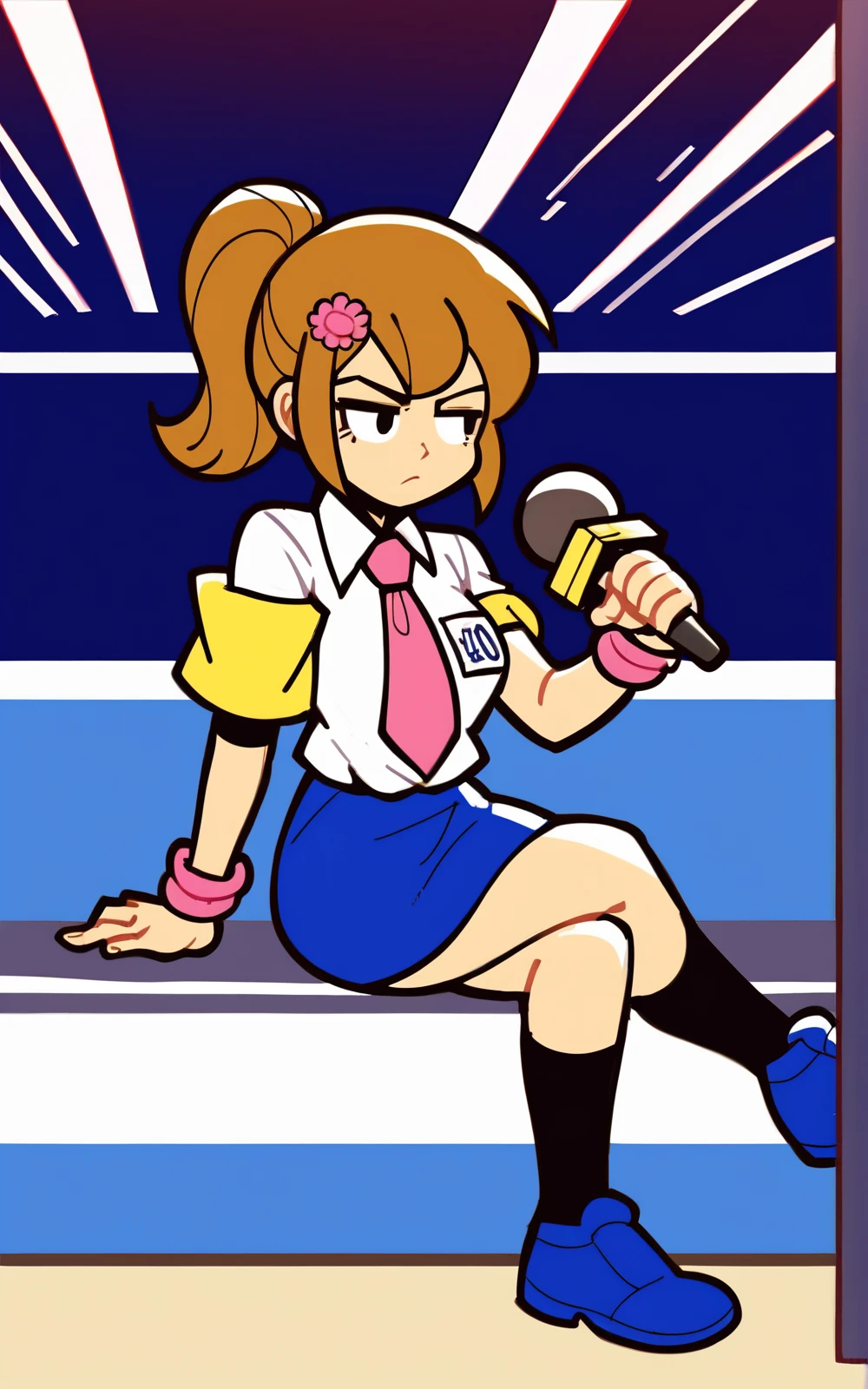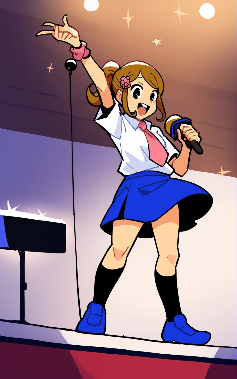 For her Outfit: white shirt, collared,pink necktie, blue skirt, black socks, kneehigh, blue footwear, hair ornament , yellow armband, pink wristband