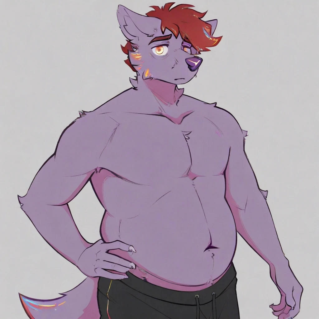 2d, 2d art, (perfect art style, male, solo), (yellow eyes, detailed eyes), (source_furry, furry, anthro), canine, wolf, anthro, (purple fur:1.1), dark purple nose, fluffy tail, short red hair,
