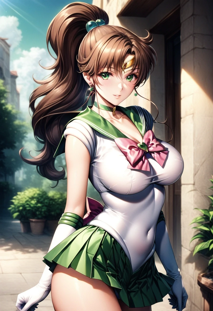 Trigger words: jupiter_a_pxl, 1girl, solo, sailor jupiter, long hair, ponytail, brown hair, hair ornament, green eyes, large breasts, circlet, jewelry, earrings, choker, green choker, sailor collar, green sailor collar, sailor senshi uniform, green skirt, pink bow, knee boots, white elbow gloves,