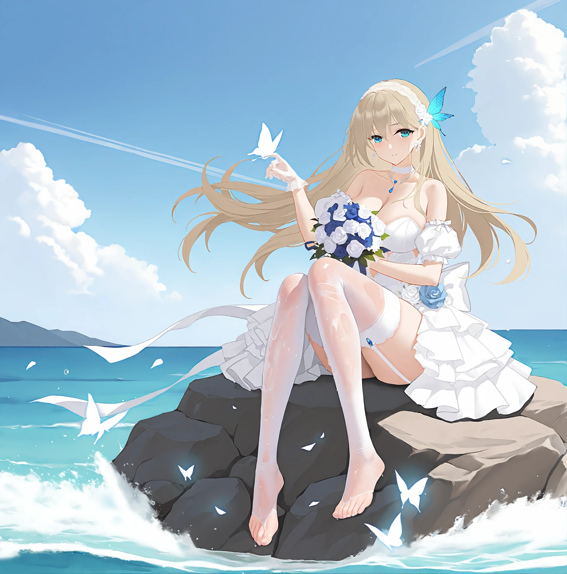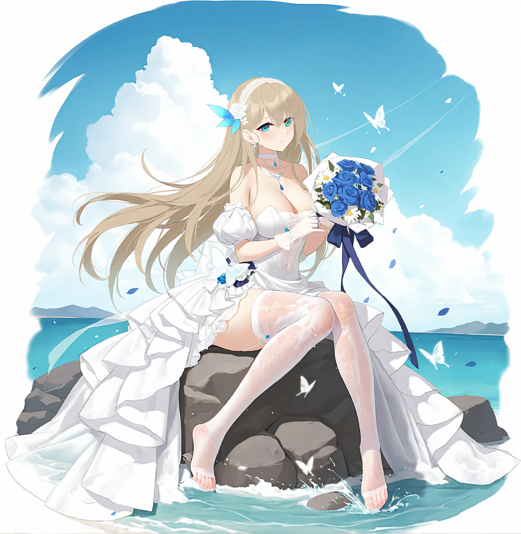 非强制性触发词white ribbon, 1girl, rock, blonde hair, cleavage, water, solo, holding bouquet, full body, looking at viewer, bare shoulders, feet, legs, blue sky, cloud, outdoors, wind, waves, floating hair, toes, splashing, wedding dress, white dress, strapless dress, large breasts, blue eyes, day, puffy short sleeves, puffy detached sleeves, official alternate costume, blue feather hair ornament, feather hair ornament, blue feathers, white choker, white gloves, butterfly on hand, falling petals, white elastic band, white garter straps, sitting, sitting on rock, necklace, earrings, blue gemstone, wet clothes, see-through, white thighhighs, frilled dress, white rose, blue rose, toenails, very long hair, ocean, see-through thighhighs, wet thighhighs, no shoes, lace trim, lace dress, layered dress, lace bow, back bow, lace hairband, white bow, transparent butterfly, white butterfly, butterfly on bouquet, hair flower, white hair flower, daisy, satin dress, lace gloves, blue ribbon, character:lexington (cv-16) (warship girls r), tachi-e