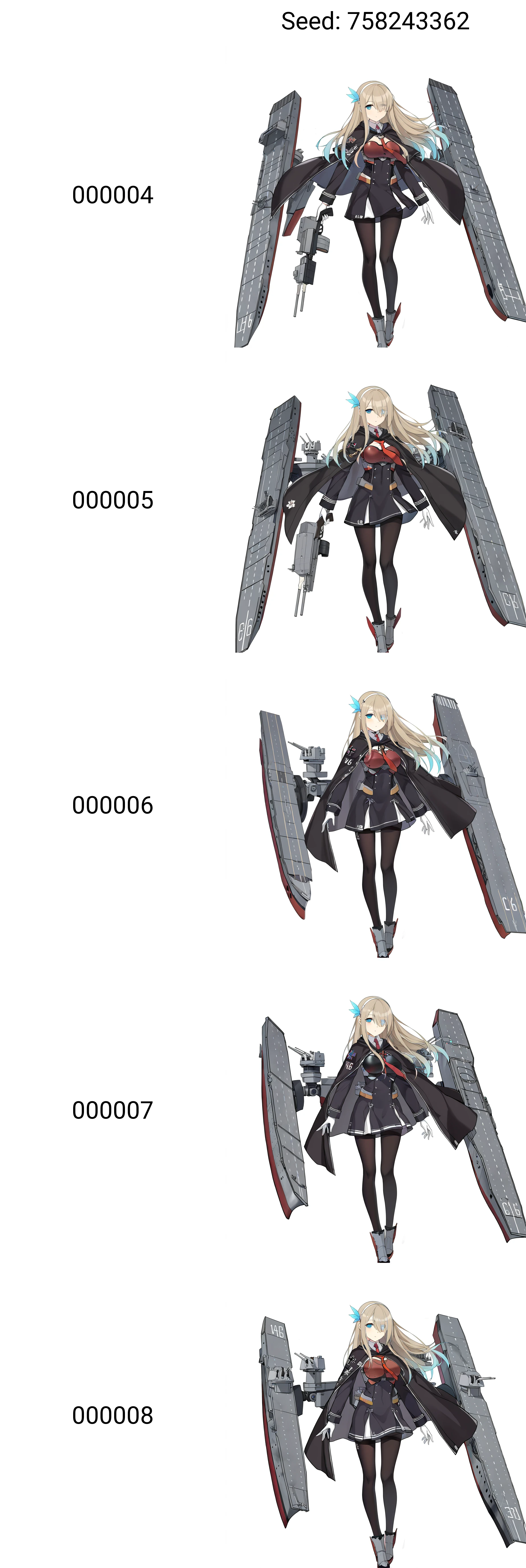 非强制性触发词1girl, character:lexington (cv-16) (warship girls r), solo, full body, looking at viewer, floating hair, holding gun, standing on one leg, closed mouth, blue eyes, eyes visible through hair, v-shaped eyebrows, white hairband, blonde hair, very long hair, feather hair ornament, large breasts, chest guard, leg up, capelet, black gloves, black cape, armored boots, metal gloves, black thighhighs, two-tone dress, black dress, white dress, short dress, clothes writing, official alternate costume, shoulder patch, skindentation, belt, metal collar, zettai ryouiki, finger on trigger, anti-aircraft gun, name tag, flight deck, rigging, machinery, handgun, blue feathers, zipper, contrail, bomber, fighter jet, adapted turret, turret, a-3 skywarrior, a-4 skyhawk, blue feather hair ornament, blue contrail, blue shoulder patch, red chest guard, white handgun, magazine (weapon), tactical light, tachi-e, t-2c buckeye