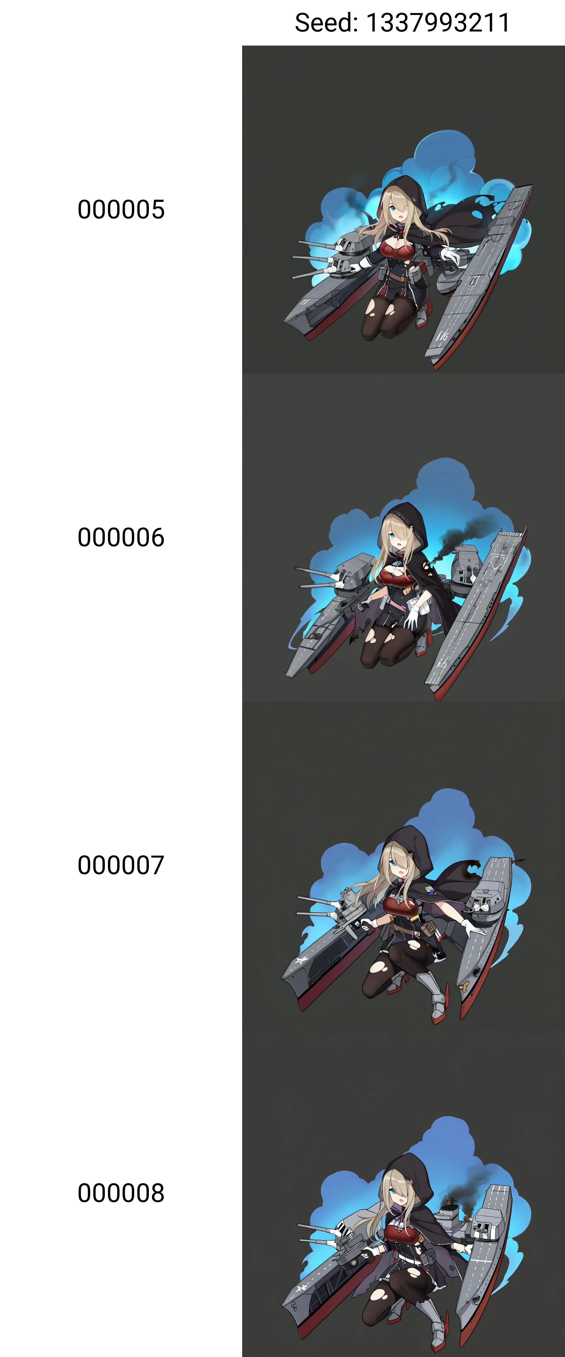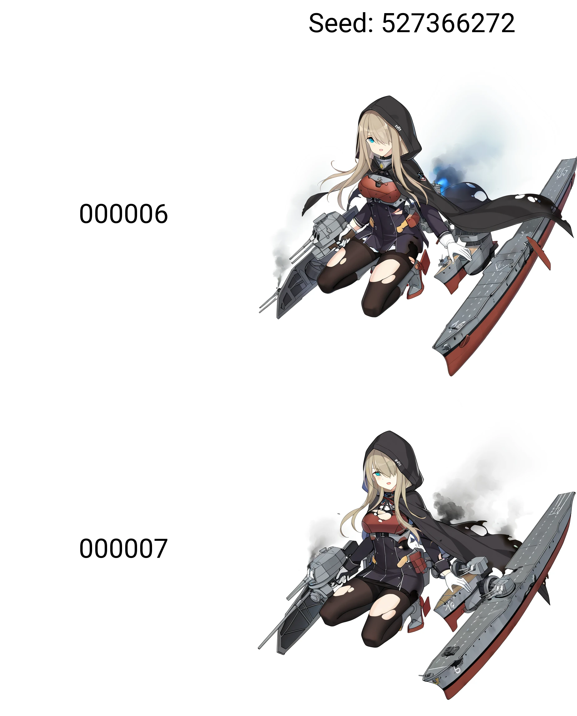 非强制性触发词adapted turret, 1girl, tbf avenger, flight deck, solo, hair over one eye, rudder footwear, torn pantyhose, smoke, full body, black pantyhose, long hair, hood up, damaged, open mouth, hooded cape, black dress, black cape, long sleeves, squatting, blonde hair, simple background, short dress, looking at viewer, airplane, rigging, machinery, large breasts, character:lexington (cv-16) (warship girls r), armored boots, red chest guard, chest guard, blue smoke, black smoke, holding gun, propeller, bolt (hardware), white gloves, blue eyes, belt pouch, framed breasts, tachi-e, torn dress, torn cape