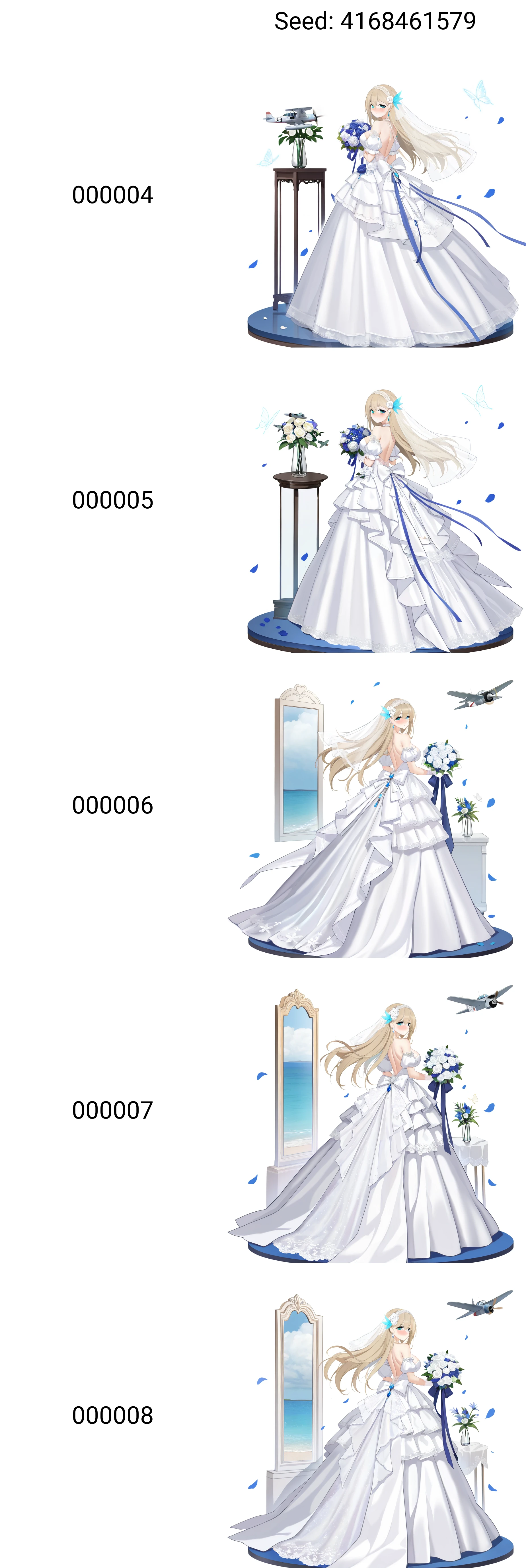 非强制性触发词vase, photo (object), 1girl, long hair, blonde hair, blue eyes, picture frame, looking at viewer, dress flower, bare shoulders, lace trim, layered dress, large breasts, white gloves, bride, looking back, strapless dress, white dress, blue feather hair ornament, wedding dress, solo, holding bouquet, long dress, gown, backless dress, blue flower, white rose, full body, ta-4j, model airplane, back bow, blue ribbon, earrings, blush, ocean, lace bow, dress bow, satin dress, veil, standing, puffy detached sleeves, puffy short sleeves, official alternate costume, frilled dress, display, glass, glass vase, feather hair ornament, blue feathers, lace hairband, white hairband, daisy, hair flower, white hair flower, falling petals, lace gloves, blue gemstone, white bow, white choker, floating hair, lace applique, white applique, transparent butterfly, white butterfly, white ribbon, character:lexington (cv-16) (warship girls r), tachi-e